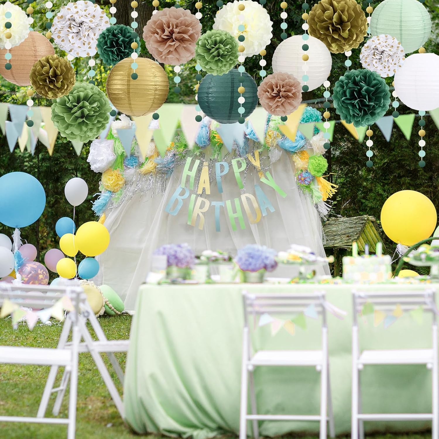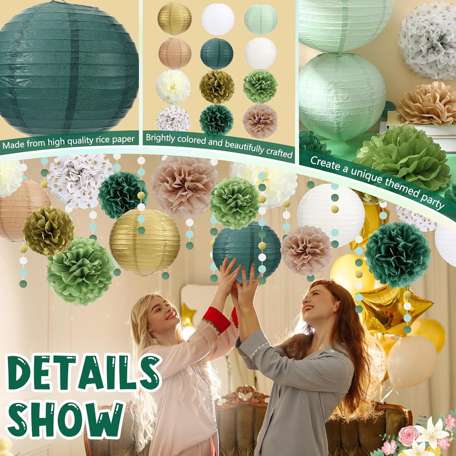Features: Our paper pom pom decorations, paper lanterns and sage green circle dot garland are not only vibrant and appealing but also easy to assemble. You can quickly set up these decorations, saving time and effort. Specifications: Material: Lantern: paper, Metal Frame Flowers and garland: paper Color: sage green Size: Lantern: about 10 inch, 12 inch Tissue paper pom poms: about 8 inch, 10 inch Garland: about 6.56 ft/ 2 m Package includes: 12 x Sage pom poms 12 x Hanging paper lanterns 2 x Circle dot garland Notes: Manual measurement, please allow slight errors on size. The color may exist a slight difference due to different screen displays.