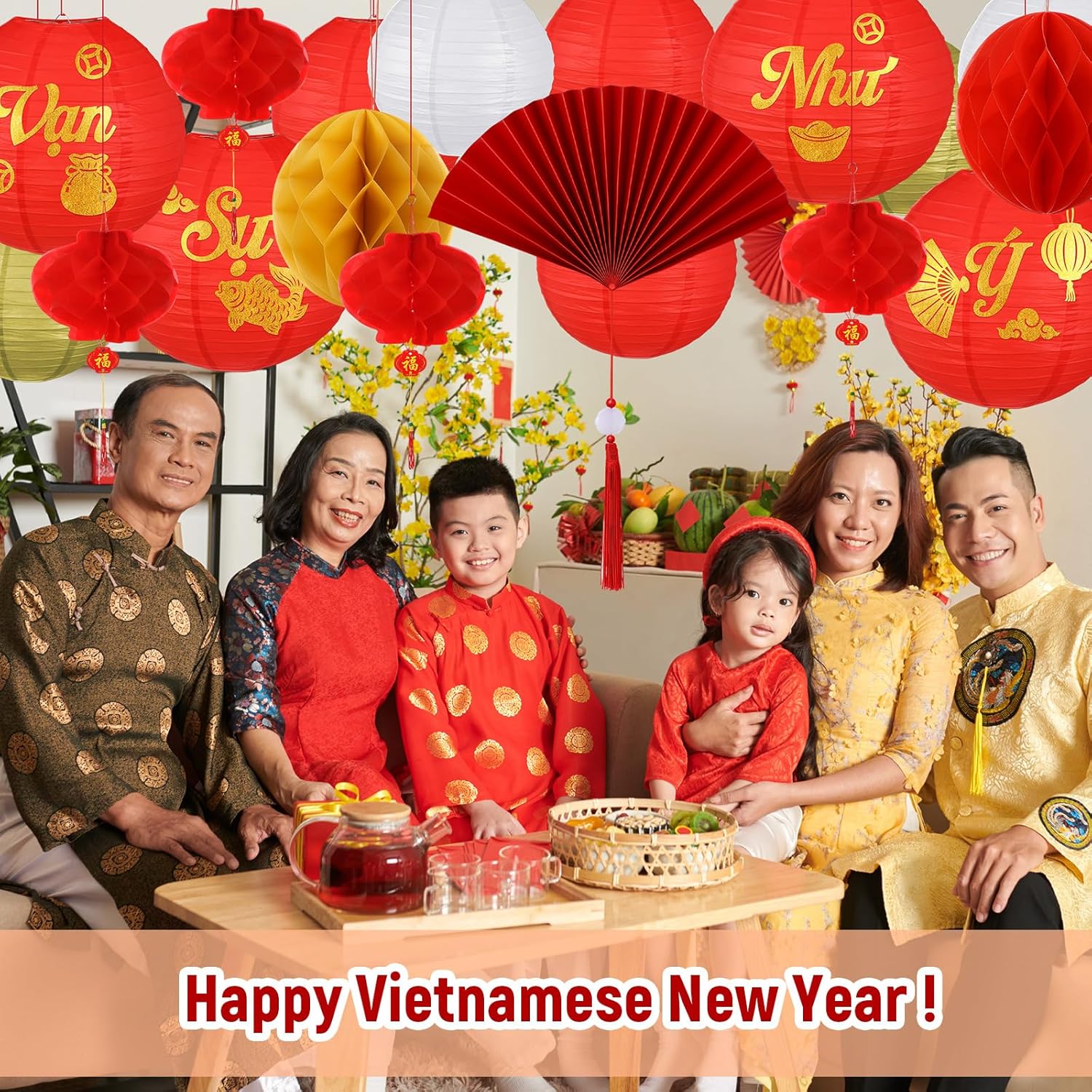 Features: Vietnamese Lunar New Year decorations bring a vibrant and festive atmosphere to any space. The combination of red, gold, and white colors symbolizes good fortune, happiness, and prosperity, making them ideal for welcoming the new year. Specifications: Material: paper Color: red, gold and white Size: folding fan is about 11.8 inches/ 30 cm and 9.8 inches/ 25 cm. Fu lantern is 9.8 inches/ 25 cm. Honeycomb ball is about 5.9 inches/ 15 cm Package includes: 1 x Folding fan 6 x Fu lantern 4 x Fan 2 x Honeycomb ball 20 x Folding lantern Notes: Manual measurement, please allow slight errors on size. The color may exist a slight difference due to different screen displays.