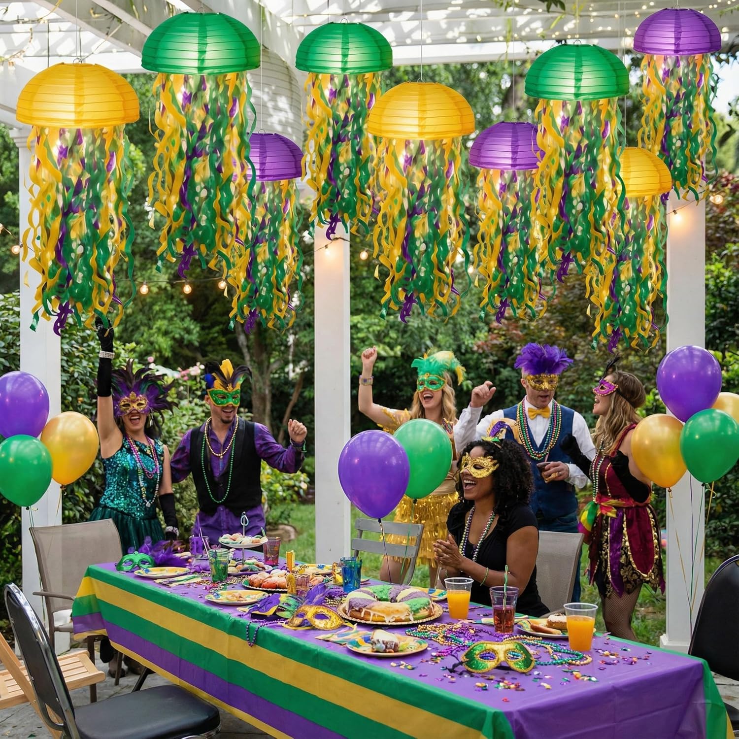 Features: A brightly colored swirling curtain is pasted on the bottom of the semi-circular lantern, making the paper lantern come to life. Suitable for carnivals and festival parties, its sparkly design creates an unforgettable atmosphere for any occasion. Specifications: Material: paper Color: purple green yellow Size: 10 inch Package includes: 9 x Mardi Gras lanterns Notes: Manual measurement, please allow slight errors on size. The color may exist a slight difference due to different screen displays.