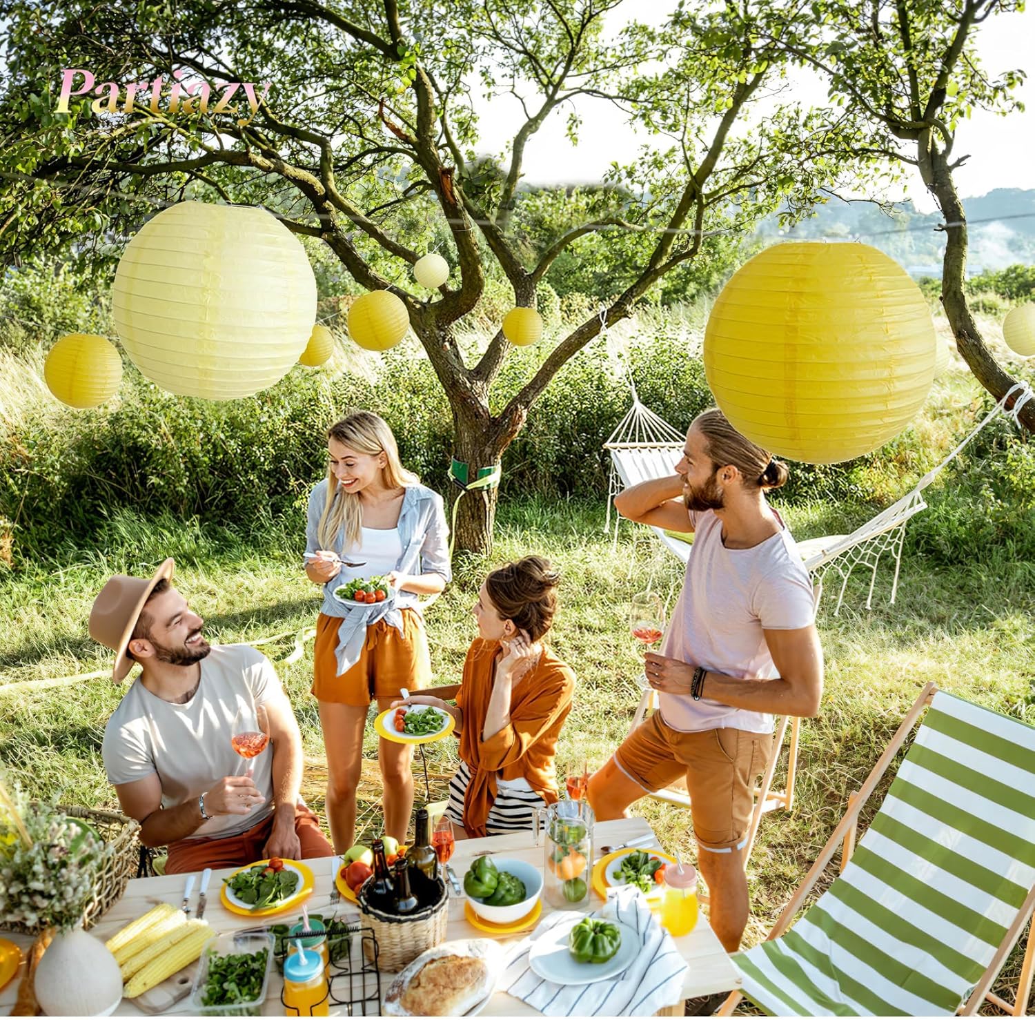 There are a total of 40 yellow round decorative lanterns made of premium paper, including 8 pieces of 10-inch paper lantern, 16 pieces of 8-inch paper lantern, and 16 pieces of 6-inch paper lantern. The combination of yellow and light yellow is the symbol of elegance, freshness and nature. Due to its convenience and reusability, the yellow and light yellow decorative paper lanterns are widely used for wedding ceremonies, birthday parties, festival ceremonies, home decoration and so on.