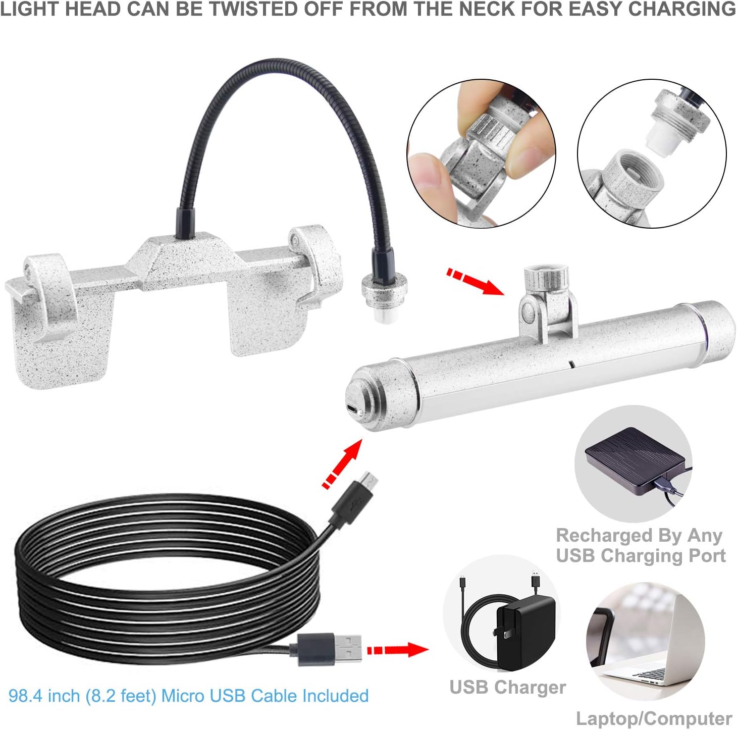 More Details *200 Lumens,28 super bright SMD LEDs, 1.5W, 30,000 hours lifespan. 3 lighting modes: 3000K warm white light, 4300K natural white light and 8000K cool white light.*Material:Plastic shape+Metal goose neck.*The picture light is powered by USB, 5-6 hours full charging time. The led indicator will auto off once the batteries are fully charged.*The remote control will operate lights within 20 feet.Up to 10 lights can be controlled by one remote control.*2 control ways: Remote control and Manual operation using ON/OFF switch.You can also change the brightness level of each color by using ON/OFF switch.InstallationDetachable Clip Mount Bracket (included)1. Attach Detachable Clip Mount Bracket to light by turning the clip bracket clockwise until it is tight. Hand tighten only.2. Open clips, to attach Detachable Clip Mount Bracket to picture frame. For frames 1/2" to 1-1/4" thick.3. Adjust neck and tilt head to desired position.Detachable Screw Mount Bracket (included)1. Remove Detachable Clip Mount Bracket from flexible neck by rotating the Clip Mount Bracket counter-clockwise until loose.2. Place screw end of flexible neck into screw mount bracket. Hand tighten only. Do not over tighten. 3. Place screw mount bracket over top of the frame with the screw holes facing the back of frame.4.Drill a pilot hole for each screw.Insert up to three (3) screws (included) through the holes in the screw mount bracket to secure properly.5. Adjust neck and tilt head to desired position. Replacement remote control battery: Unscrew the screw on the back of remote, and then pull out the battery box to change the remote battery. Packing List- 1 x Picture Light- 1 x Remote Control ( included CR2025 button cell battery)- 1 x Micro-USB Charging Cable- 3 x Screw- 1 x User Manual