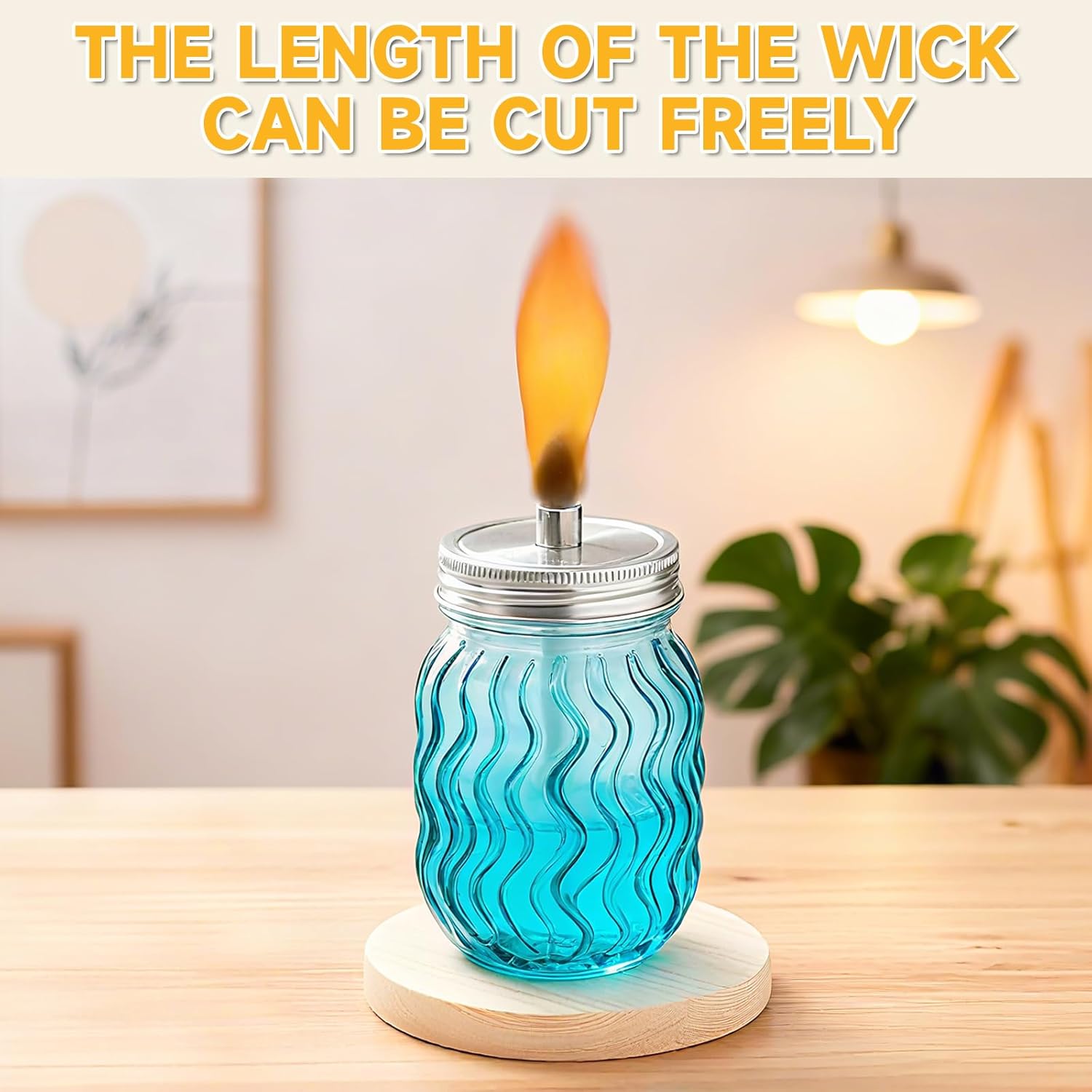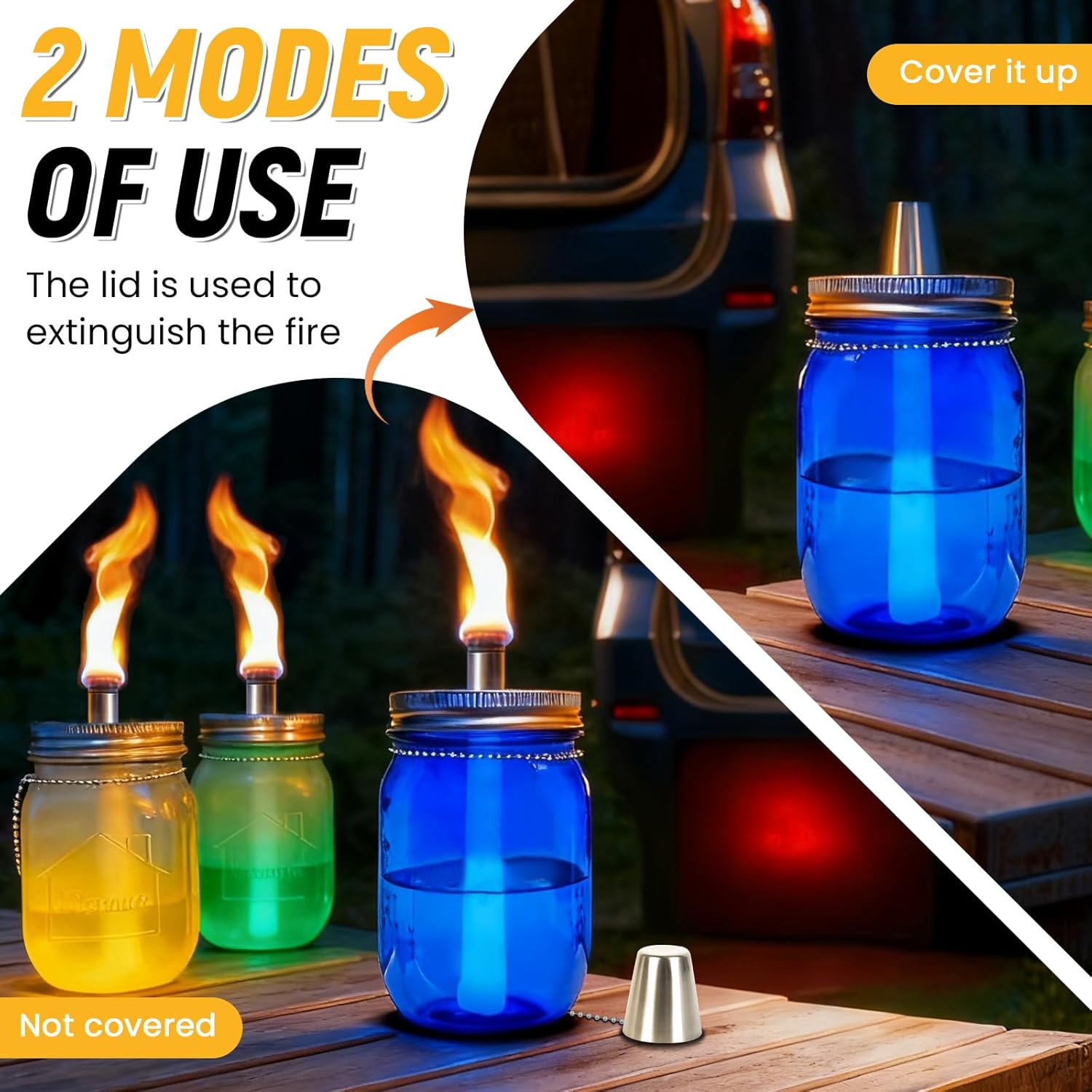 Product Specifications: 1. Kit Contents 4 rust-proof metal lids (fits standard Mason jars, approximately 4-inch inner diameter) 4 high-density fiberglass wicks (customizable length, long burn time) 4 metal fire cover caps with chains (for instant extinguishing radiances and protecting hands from heat) Note: You must provide your own Mason jars and lamp oil; the jars and fuel are not included. 2. Materials and Craftsmanship Metal Cap: High-quality cold-rolled steel with environmentally friendly paint, rust-resistant and heat-resistant, retains shape after repeated use Wick: 100% fiberglass, smokeless and odorless, with high oil absorption and a burn time of 6-8 hours per burn Protective Tube: Made of borosilicate glass, heat-resistant and explosion-proof, easy to clean and reuse 3. Installation and Use Step 1: Insert the wick through the hole in the bottle cap and secure it in the protective tube. Step 2: Fill the Mason jar with lamp oil (vegetable oil is recommended). Step 3: Tighten the cap, light the wick, and adjust the length to control the radiance size. Step 4: After use, directly cover the radiance with a chain cover cap to extinguish it. Refill the wick after cooling. 4. Suitable for: Camping, beach dinners, patio parties, garden path lighting Indoor: Dining table centerpieces, bar counter lighting, B&B and hotel furnishings Special Uses: Wedding decorations, holiday celebrations, photography background props 5. Precautions and After-Sales Service Use only liquid lamp oil. Do not use flammable or explosive fuels such as alcohol and gasoline. Keep the lamp upright and away from children, pets, and flammable objects. When cleaning, allow the lamp to cool completely and then wipe the lid with a soft cloth.