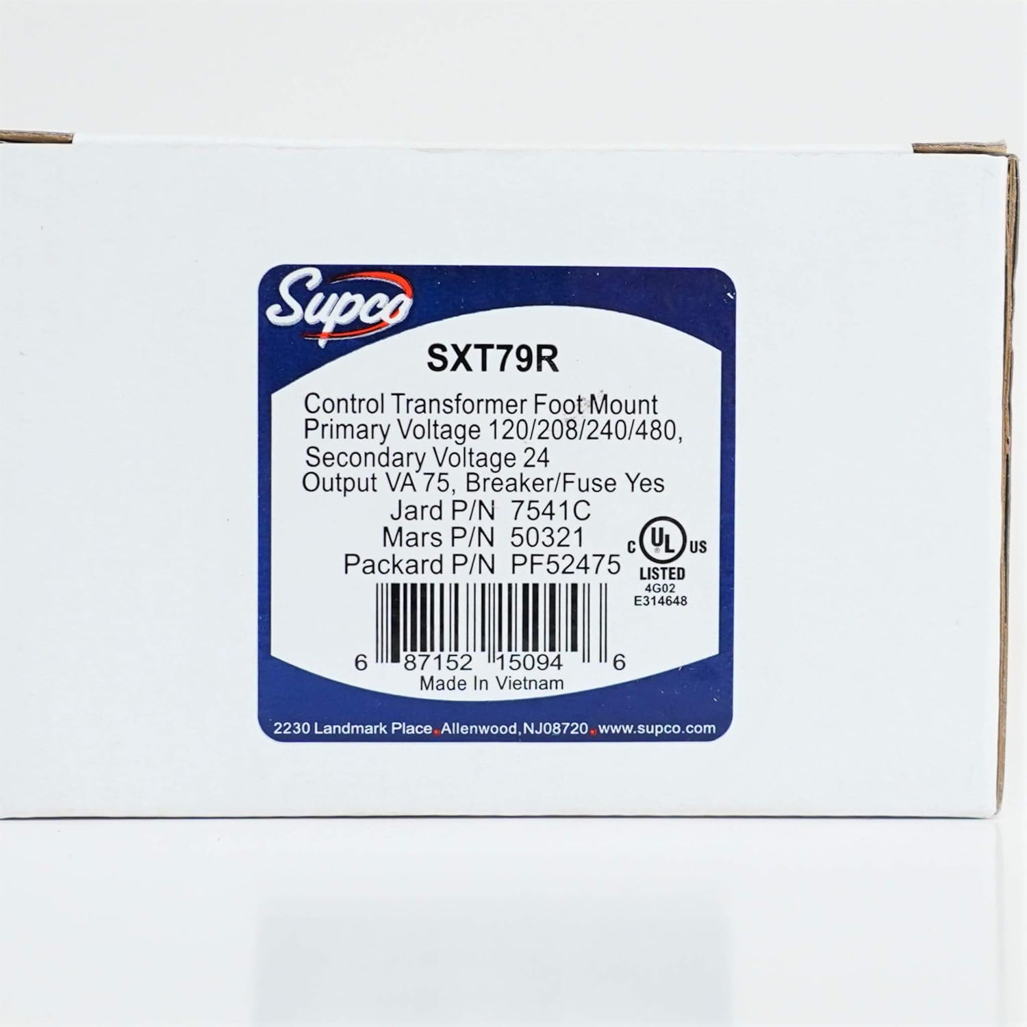 Supco part number SXT79R.Control Transformer with Breaker.Designed for HVAC/R applicationsPrimary Voltage: 120/208/240/480Secondary Voltage: 24VA Rating: 75Foot MountSpecifications:Rating: Class 2Mount type: FootBreaker/Fuse: Circuit BreakerOutput voltage: 75VASecondary voltage: 24VACPrimary voltage: 120/208/240/480VACAgency: URReplacement for: Jard 7541C, Mars 50321, UEI UET79R, White-Rodgers 90-T75C3, Honeywell AT88A1005, AT88A1021, AT88A1047