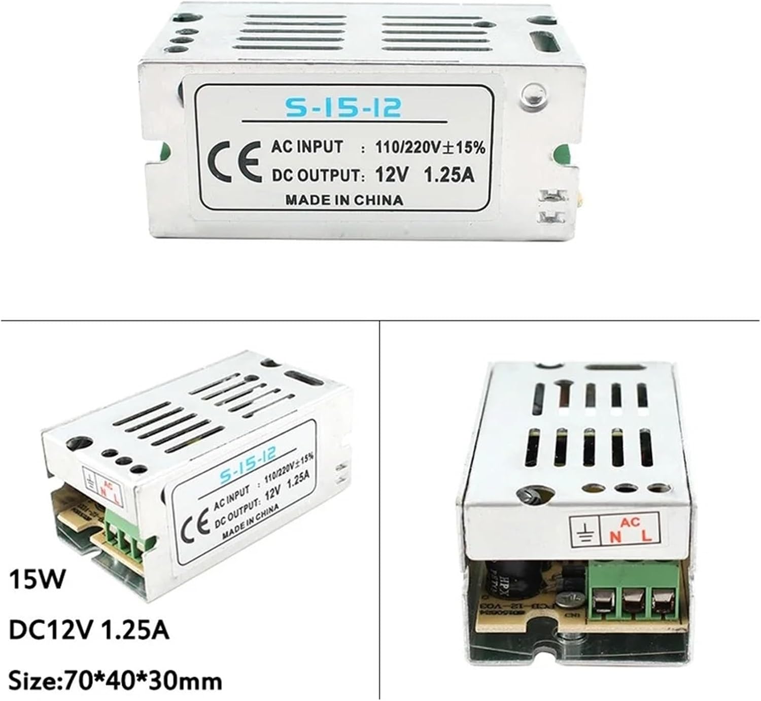 Low Voltage TransformersLED Light Strip Transformer 220V to 12V DC 5V 12V 24V 3A 5A 10A 15A 20A 5 12 24 V Volt LED Light Strip Power AdapterSpecification:Input voltage: AC 110V-220V±15%Output voltage: DC12VOutput current: 1A, 2A, 3A, 5A, etc.Power: Amperes times voltsShell material: metal shell/aluminum shellWorking temperature: 0~40℃Storage temperature: -20~60℃Environmental humidity: 0~95%, no condensationSafety Compliance: FCC/CE/RohsBuilt-in overvoltage, overcurrent, short circuit protectionconnect:L, N: AC power inputGND: DC power output "-"V: DC power output "+"+V/ADJ: adjust the output voltageWorking temperature: 0~40℃Storage temperature: -20~60℃Environmental humidity: 0~95%, no condensationaspect:(Manual measurement, there may be 3-5mm measurement error.)Type (output)Dimensions (length x width x height)Input voltage (AC)