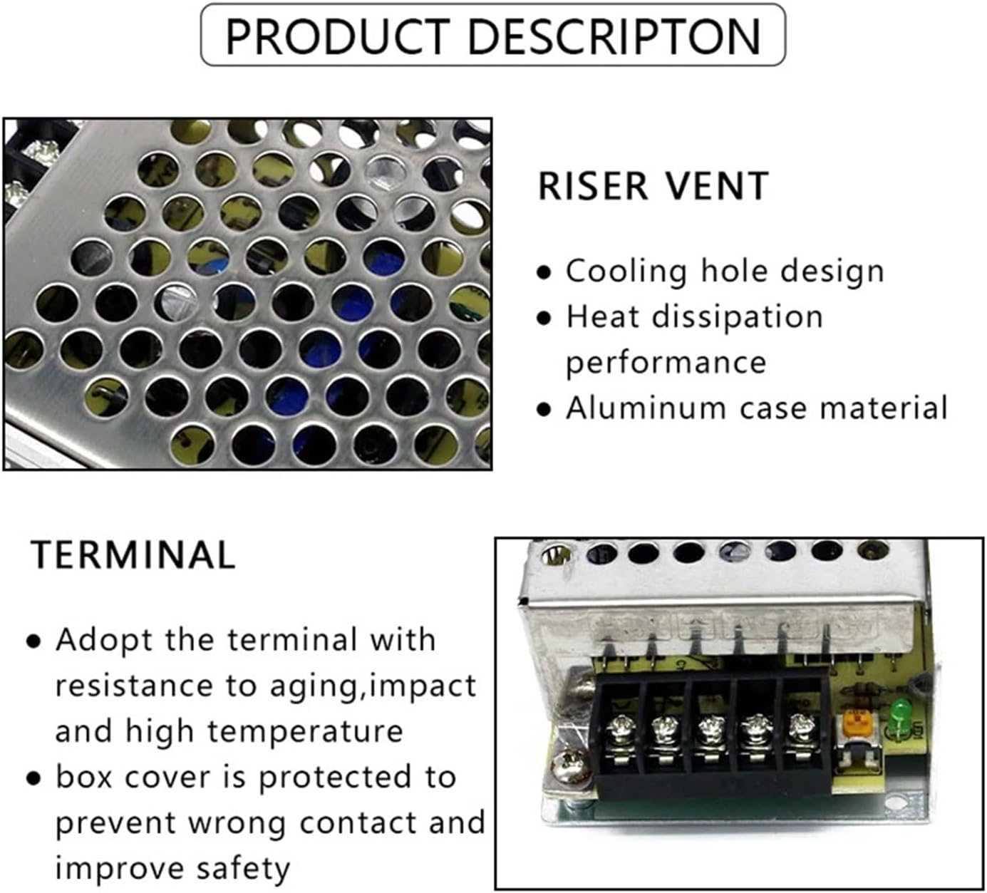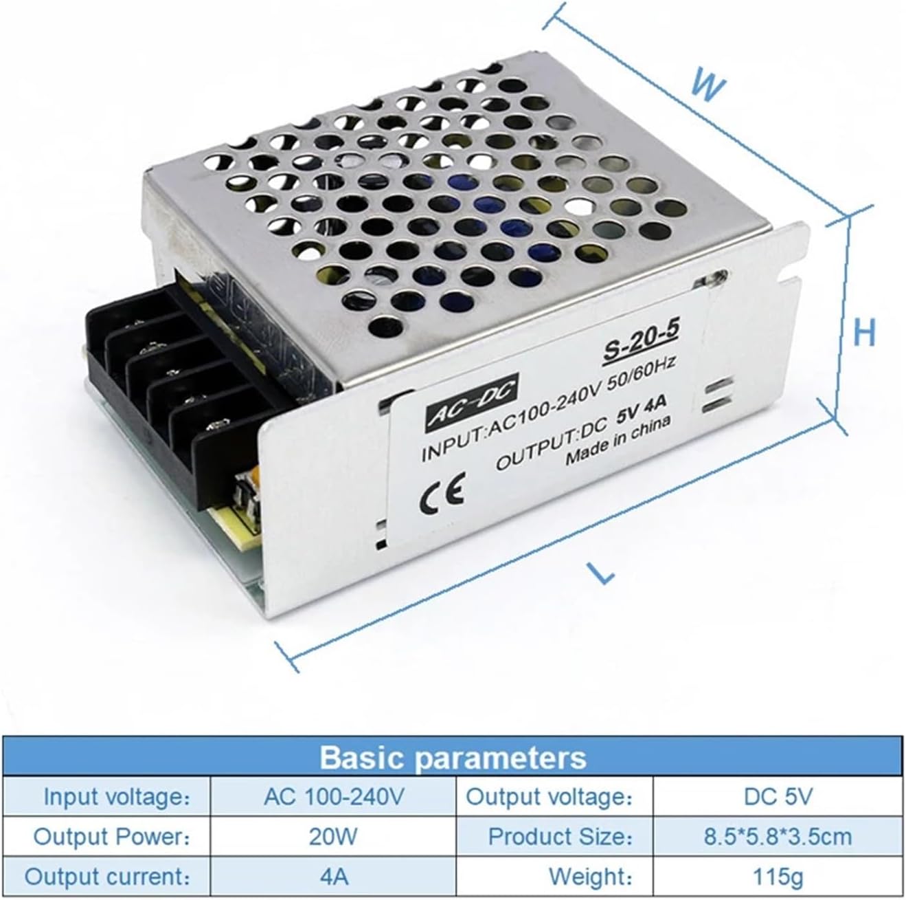 Low Voltage TransformersOutput Power : 20WOutput Current : 4AModel Number : S-20-5Output Frequency : 47-63HZOutput Type : SINGLECertification : CE,RoHSType : AC/DC power supplyModulation method : pulse width modulation (PWM) typeTransistor connection : half bridgeInput voltage : AC100-240VOutput power : 20WOutput voltage : 5VWork efficiency : 87%Output ripple noise : 120mVp-pOutput voltage accuracy : ±1.0 (%)Voltage adjustment range : 10 (%)Product certification : ce ROHSOutput current : 4AWorking frequency : 47-63HZSize (mm): : L85*W58*H35Scope of application : LED, security, industrial control, motorWorking environment temperature : -40 to 65Installation method : screw installationProtection class : IP20Weight : 115gRemarks : Do not use overloadReset method : self-recoveryCooling Type : Free CoolingShell material : metal