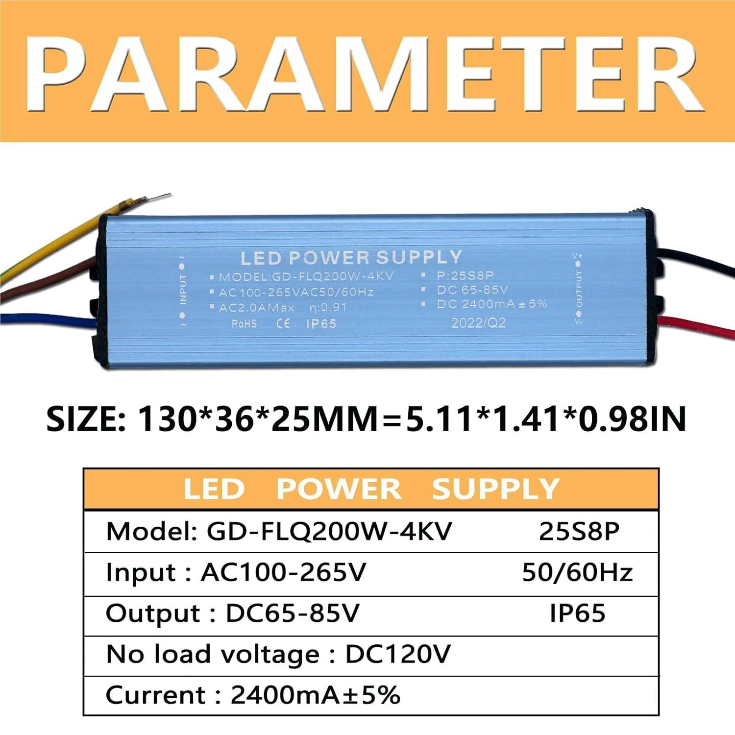 Low Voltage TransformersProduct specifications100W LED Power Supply:Anti surge level: 4KVWaterproof grade: IP65Serial and parallel mode: 25S4PInput voltage: AC100-265V 50/60HzOutput voltage: DC65-85VNo load voltage: DC120V (maximum)Output current: 1200mA ± 5%Certification: RoHS/CE/PF 95%150W LED Power Supply:Anti surge level: 4KVWaterproof grade: IP65Serial and parallel mode: 25S6PInput voltage: AC100-277V 50/60HzOutput voltage: DC65-85VNo load voltage: DC120V (maximum)Output current: 1800mA ± 5%Certification: RoHS/CE/PF 95%200W LED Power Supply:Anti surge level: 4KVWaterproof grade: IP65Serial and parallel mode: 25S8PInput voltage: AC100-265V 50/60HzOutput voltage: DC65-85VNo load voltage: DC120V (maximum)Output current: 2400mA ± 5%Certification: RoHS/CE/PF 95%==========High-concerned chemical : NonePlug Type : NoneFeatures : Waterproof IP65Weight : 232gOutput Signal : DCInput Signal : ACOutput Voltage : 65-85VInput Voltage : 100-277VCertification : CCC,ce,ROHSWarranty : 3 YEARSMaterial : Aluminum AlloyOrigin : Mainland ChinaItem Type : Lighting TransformersPower : 100W/150W/200W100W Size : 103*29*22mm150W Size : 110*36*28mm200W Size : 130*36*25mmFeatures 1 : Non-isolated driverFeatures 2 : Waterproof IP65Features 3 : Aluminum alloy super heat dissipationNo-load voltage : DC120V (max)100W Current : 1200mA150W Current : 1800mA200W Current : 2400mA