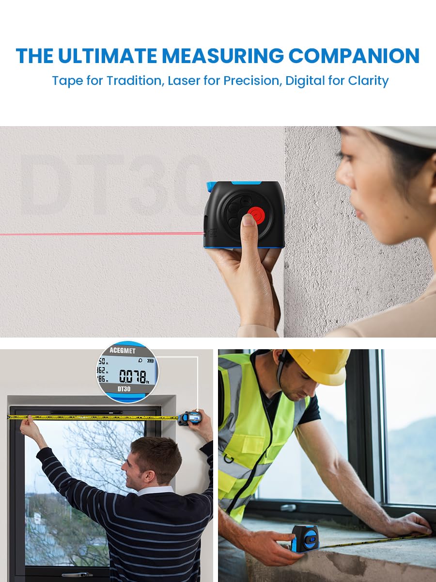 Upgrade your measuring efficiency with the ACEGMET DT30 & DTX10 dual 3-in-1 digital laser tape measure bundle, an all-in-one solution for professional construction, home renovation, interior design and real estate measurement. The ACEGMET DT30 combines a 130Ft laser distance meter and a 16Ft auto-lock physical tape, equipped with a 2-inch HD backlit display and ±1/16'' professional precision. It supports area, volume and Pythagorean calculations, stores 20 groups of measurement data, and features a magnetic hook for easy one-person use. Wireless APP sync helps you draw floor plans and export data instantly, eliminating manual errors. Complementing perfectly, the premium DTX10 reaches an ultra-long 330Ft laser range with patented AccuMeasure technology, achieving top-tier ±1/32'' accuracy. It adds an exclusive green alignment laser for precise marking, arbitrary zeroing and rear reference internal measurement functions. The customized color display and multi-mode unit switching make complex measuring tasks simpler. Both tools adopt USB-C rechargeable design and IP54 rugged housing to resist water, dust and impact on tough jobsites. Safe Class 2 red and green lasers ensure daily use security. Connected to the SMART LIFE App, they realize intelligent data management and sharing. All ACEGMET measuring tools enjoy a 24-month warranty and lifetime technical service, allowing every professional and DIY user to measure faster, more accurately and more easily.