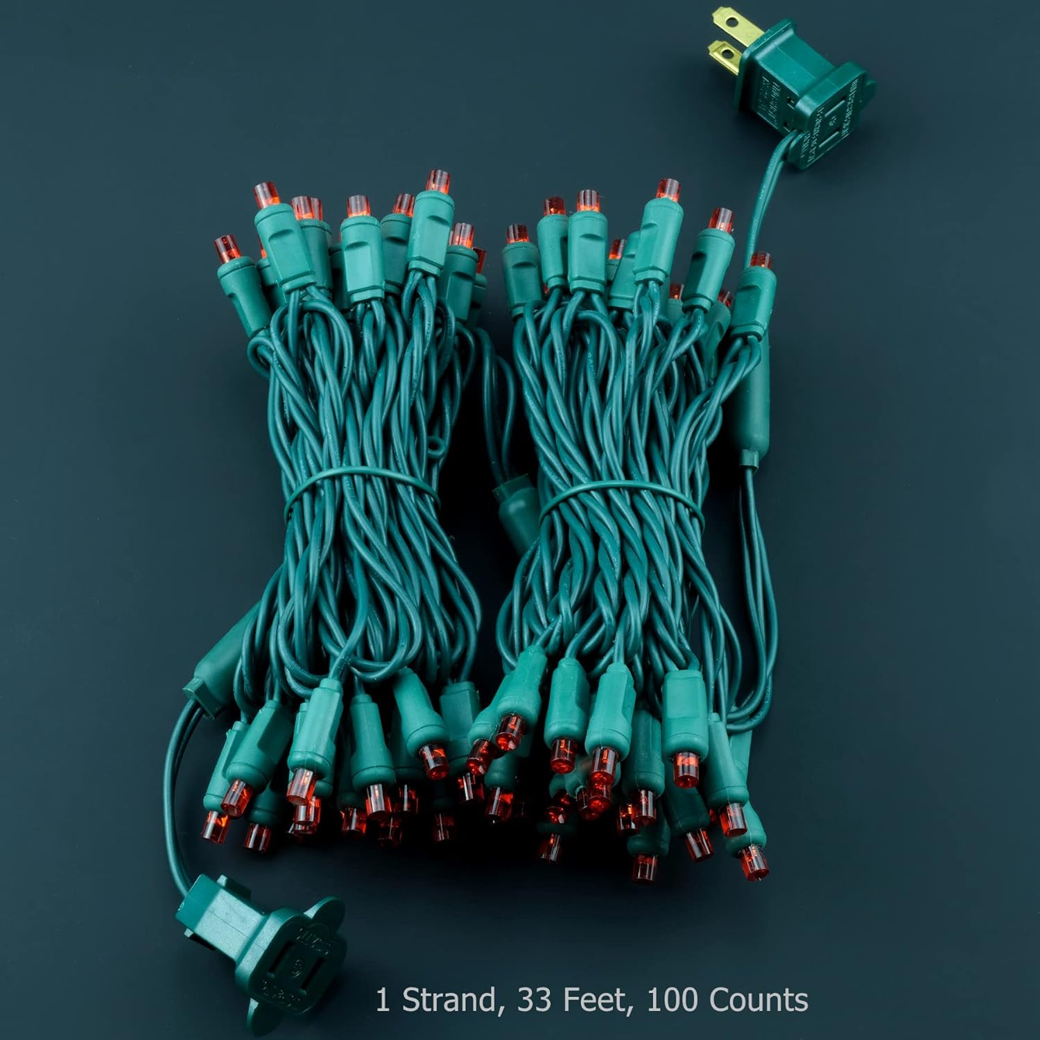 YULETIME Red 5MM LED Christmas Lights, 33 ft 100 Count 4" Spacing One-Piece High Waterproof Wide Angle UL Certified String Light (Red - Green Wire)SPECIFICATIONS LED Light Color: Red Light Display: Steady Bulb Type: LED Bulb Shape: 5MM Wide Angle Bulb Material: Acrylic Removable Bulbs: No Average Hours: 100,000 Voltage: 120 V Wire Color: Green Wire Gauge: 22 AWG Male Plug: Fused/Stackable Female Plug: End-to-End Rating: UL Certified Grade: Premium Fire Resistance Rating: Class A 105℃ Ingress Protection Rating: IP67 Usage: Indoor / Outdoor Dimensions: - Total Length: 33 ft - Lead: 4 in - Spacing: 4 in - Tail: 4 in Actual Power: - 7.2 Watts - 216 watts end-to-end maximum - 30 max sets connected WHAT'S IN THE BOX: 1 x 100 LED 5MM String Lights 2 x Extra Fuse 1 x User Manual