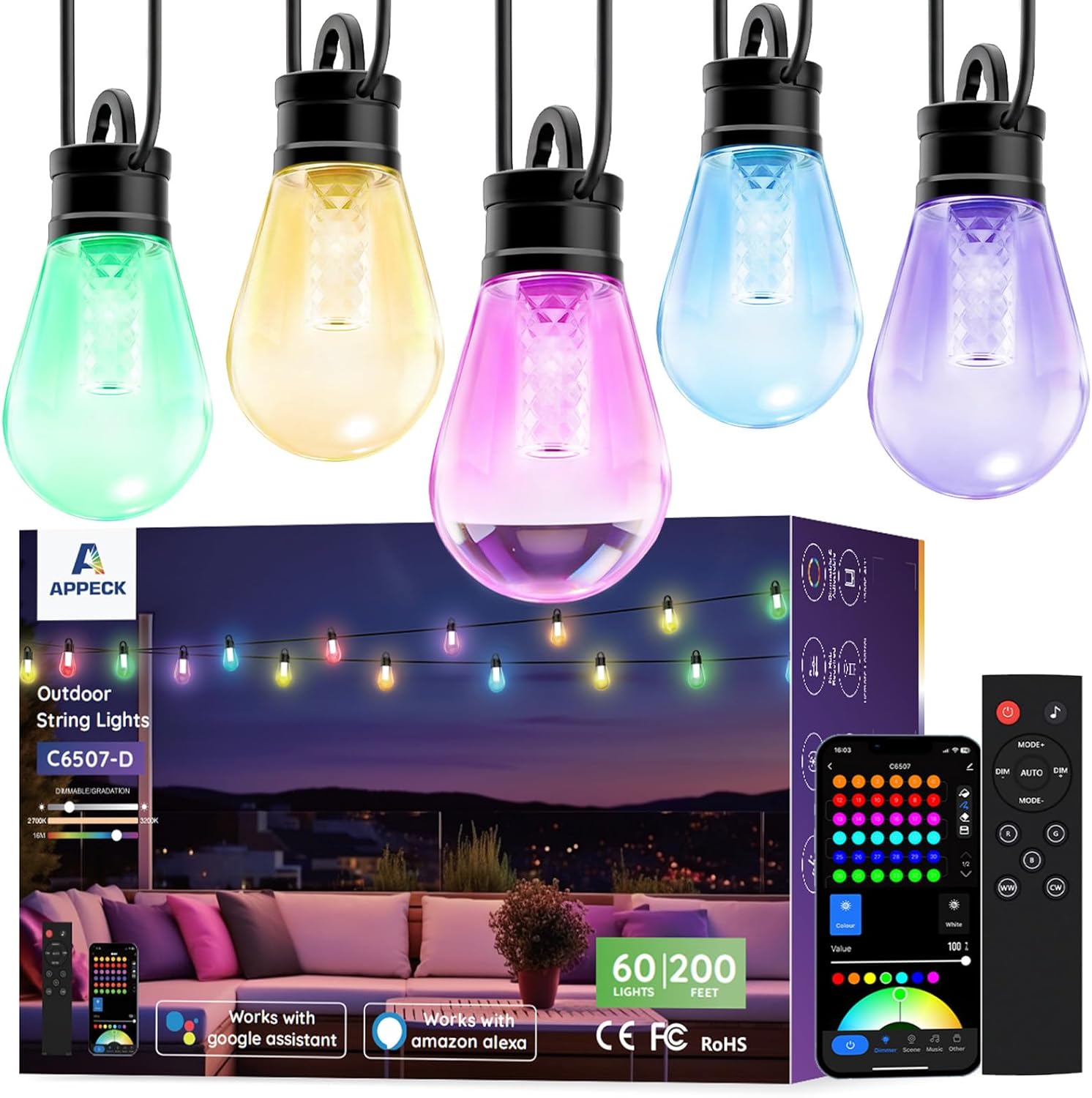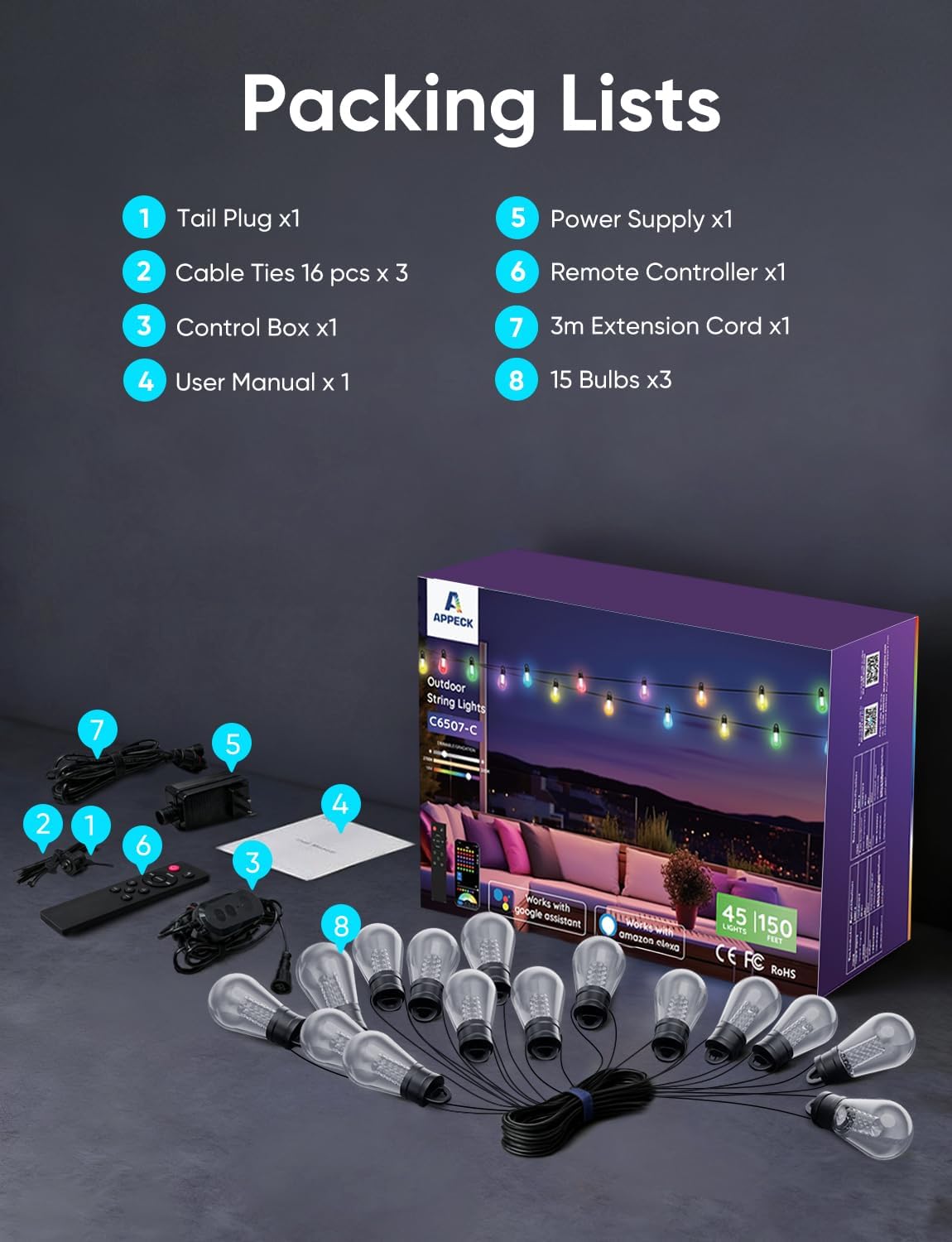 | Included Components | Cable Ties*1 Bag, Outdoor String Lights *3, Power Adapter*1, Control Box*1, Remote Control(Does not include AAA batteries)*1, Tail Plug*1, User Manual*1 |