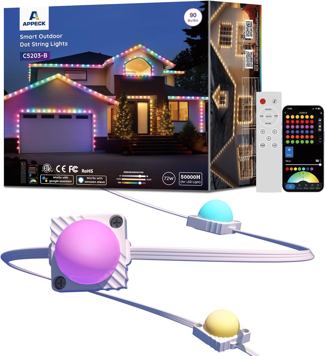 | Included Components | 14.7ft Light String x 3, Control Box x 1, Remote Controller x 1, Power Adapter x 1, Extension Cord x 1, Screw Clips Pack x 3, Tail Plug x 1, User Manual x 1 |