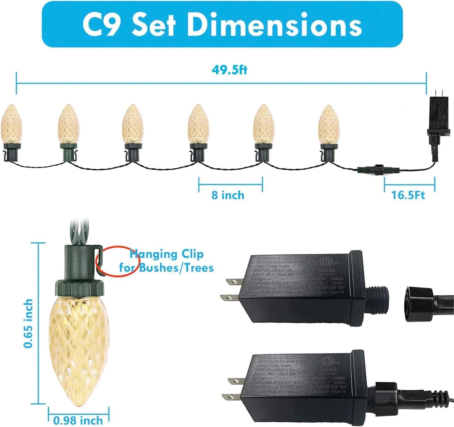 KAQ 2PK 100LED Warm White C9 Christmas Lights Waterproof Indoor Outdoor, 98FT Extendable C9 String Lights Plug in with 13 Lighting Modes, Christmas Decorations for Party Patio, Outside Yard Decor