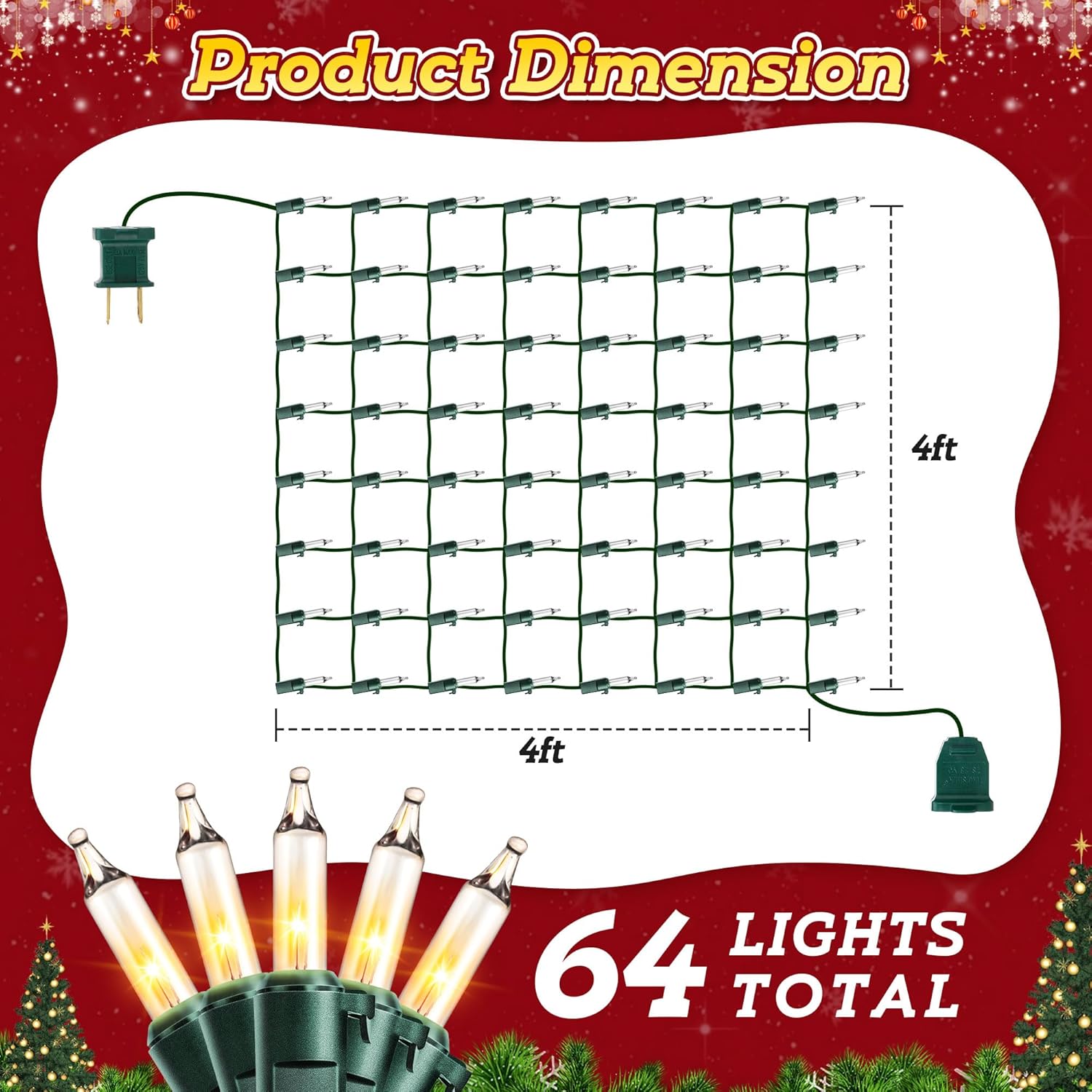 Drape your bushes in classic style incandescent net lights! ElectricWise bush net lights outdoor make it easy to celebrate every season, from Halloween to Christmas. Just connect them end-to-end to instantly cover your outdoor foliage with a warm, stunning glow. Specification: Quantity: 6 PackLight Quantity: 64 CountSize: 4ft x 4ftLamp Spacing: 6.85 inches x 6.85 inchesLead Length: 2ftTail Length: 2ftWith 2 Fuses: YesLight Color: Warm WhiteEnd To End: Connect up to 5 setsPackage Included: 6 x Mesh Christmas Lights Winding risk may exist, please keep our product away from children