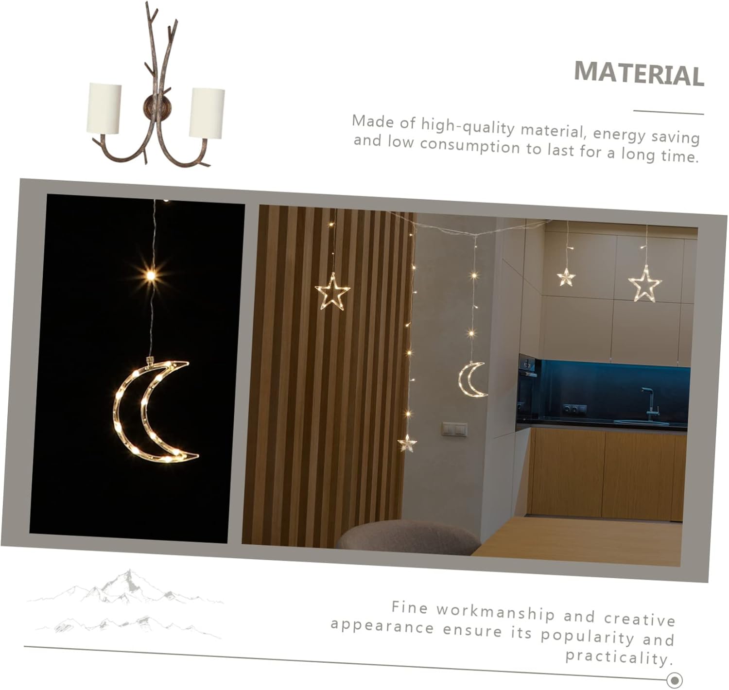 Package Include 1 x Set of String Lights Characteristics -Solar panel: 5V/320MA Atmosphere Light -Light color: colorful light Chic Light Strap -Material: PVC, Plastic Hanging Light -Control by: remote-control unit LED Light Pendant -Power: 0.5W Scene Layout Light -Lighting time: More than three Solar-powered Light -Mode: 8 lighting modes Solar LED Light -Charging time: about 6h Scene Light Decor -Size: 350.00X20.00X3.00cm/137.55X7.86X1.18in Night Light Pendant -Battery: 3.7V/1200MAH Outdoor Light Decor -This string light can be used for outdoor decoration, festival celebrations, parties, etc Yard LED Light. -Using PVC and plastic material of and fine craftsmanship, and , decorative and LED Lamp Decor. -Featured by moon and star shape design, creative and unique, adding a warm and festival atmosphere Solar Light. -Easy to beauty around plants, balconies, tree, fence, furniture and almost everything else Xmas Light Decor. -Easy to use and decorate, you can display it on the garden, lawn, yard and other places you want to decorate Hanging Light Decor.Goods InformationHanging Light Dress up your home, garden or yard, outside entryway.Garden Light Pendant It can be used anywhere, indoors or outdoors.Yard LED Light Our delicate and PVC LED string light is for decorating Christmas, new year party and some other parties.Atmosphere Light It is a addition to festival party decorations