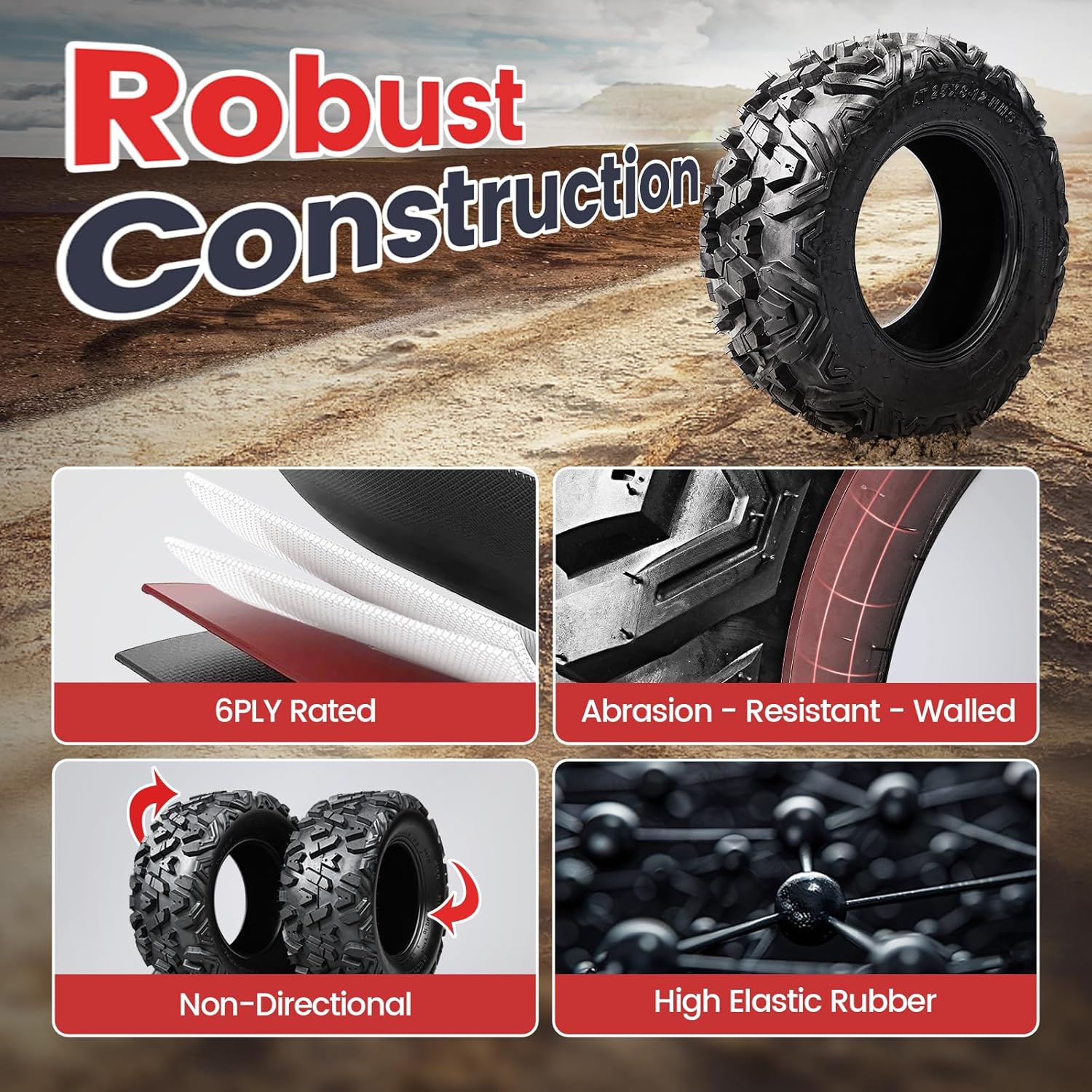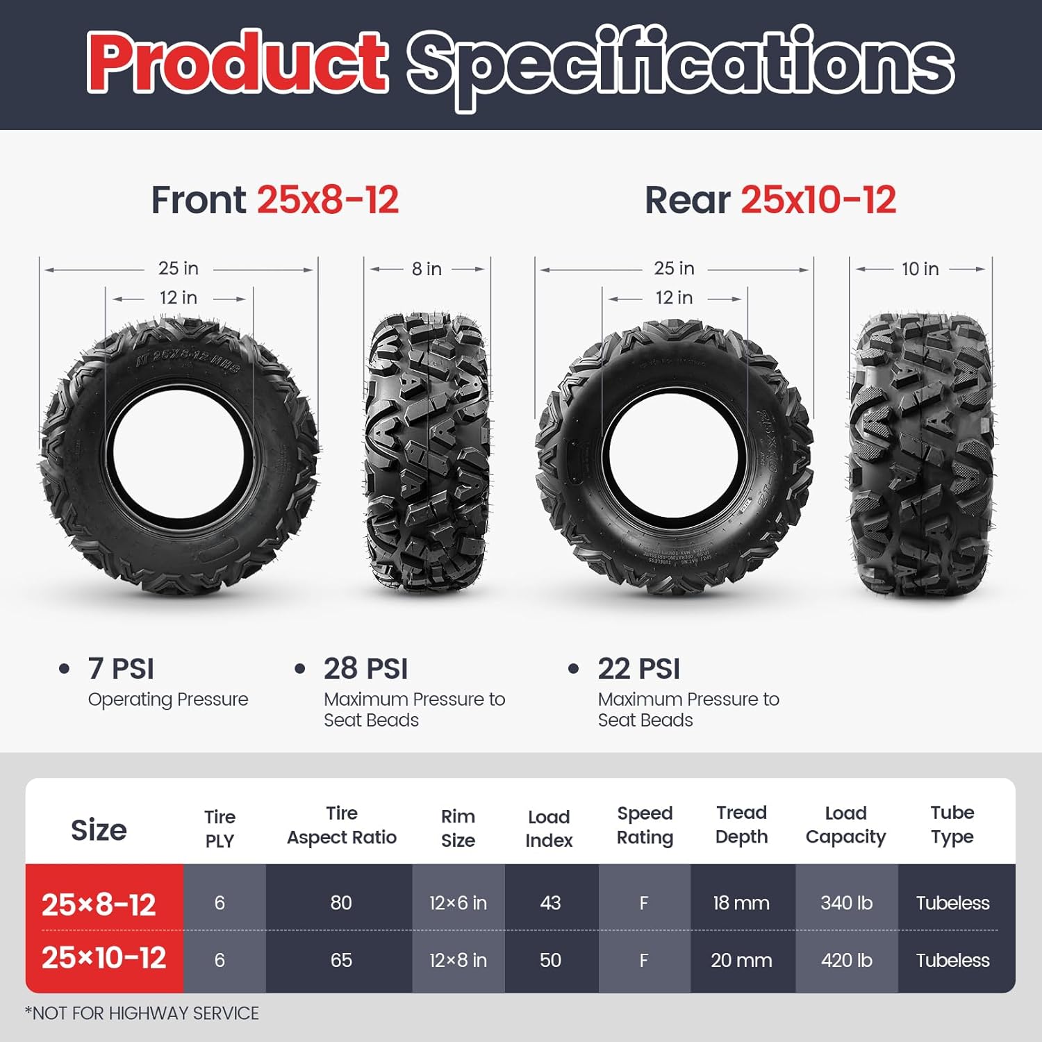 | Included Components | Box 1:1 front tire (25x8-12) & 1 rear tire (25x10-12), Box 2: 1 front tire (25x8-12) & 1 rear tire (25x10-12), Boxes may arrive separately, Please contact us if you need the full set of tracking numbers, Total of 4 tires, shipped in 2 boxes |