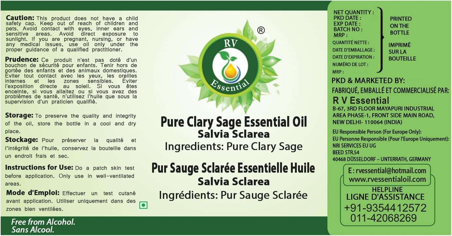 R V Essential Pure Clary Sage Essential Oil- Salvia Sclarea (100% Pure and Natural Therapeutic Grade). Oils are packed in high quality amber glass bottles till 100ml. And 300ml, 630ml & 1250ml in high quality virgin aluminium bottles.