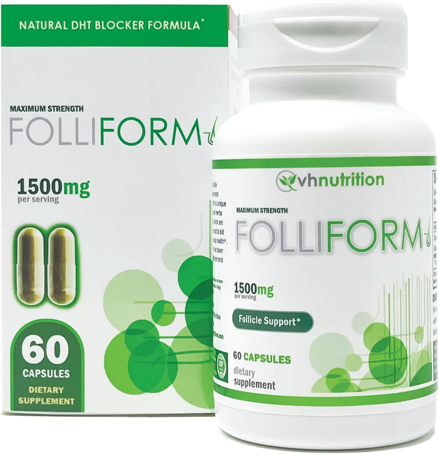 Promote healthy hair growth and manage DHT levels with VH Nutrition FOLLIFORM, a potent DHT blocker designed for both men and women. Formulated with 1500mg of Saw Palmetto, Pygeum, and Nettle Root per serving, this supplement supports hair health and overall well-being. Ideal for daily use, FOLLIFORM helps reduce hair thinning, supports hair regrowth, and promotes scalp health. Whether you're experiencing hair loss or simply looking to maintain your hair's vitality, FOLLIFORM is an excellent addition to your hair care routine. Suitable for use at home, work, or on the go, it ensures continuous support for your hair health wherever you are. Pair with a balanced diet, regular hair care, and other dietary supplements like multivitamins and biotin for comprehensive hair health support. Experience the natural way to block DHT and promote healthy hair growth with VH Nutrition FOLLIFORM.