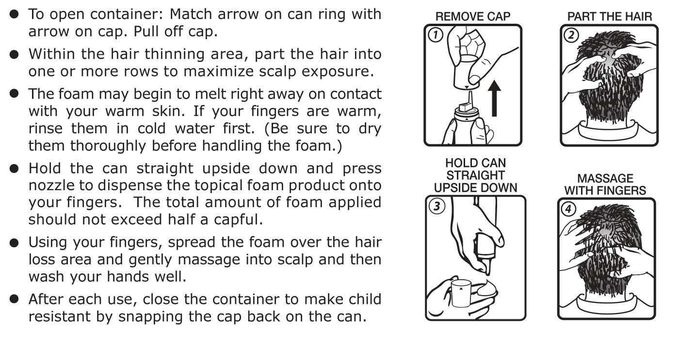 This easy-to-use foam topical treatment revitalizes hair follicles and is clinically proven to help regrow hair. It is for men who have a general thinning of hair on the top of the scalp. For best results, use Minoxidil Topical Aerosol, 5% (Foam) twice daily. Results may occur at 2 months with twice a day usage.
