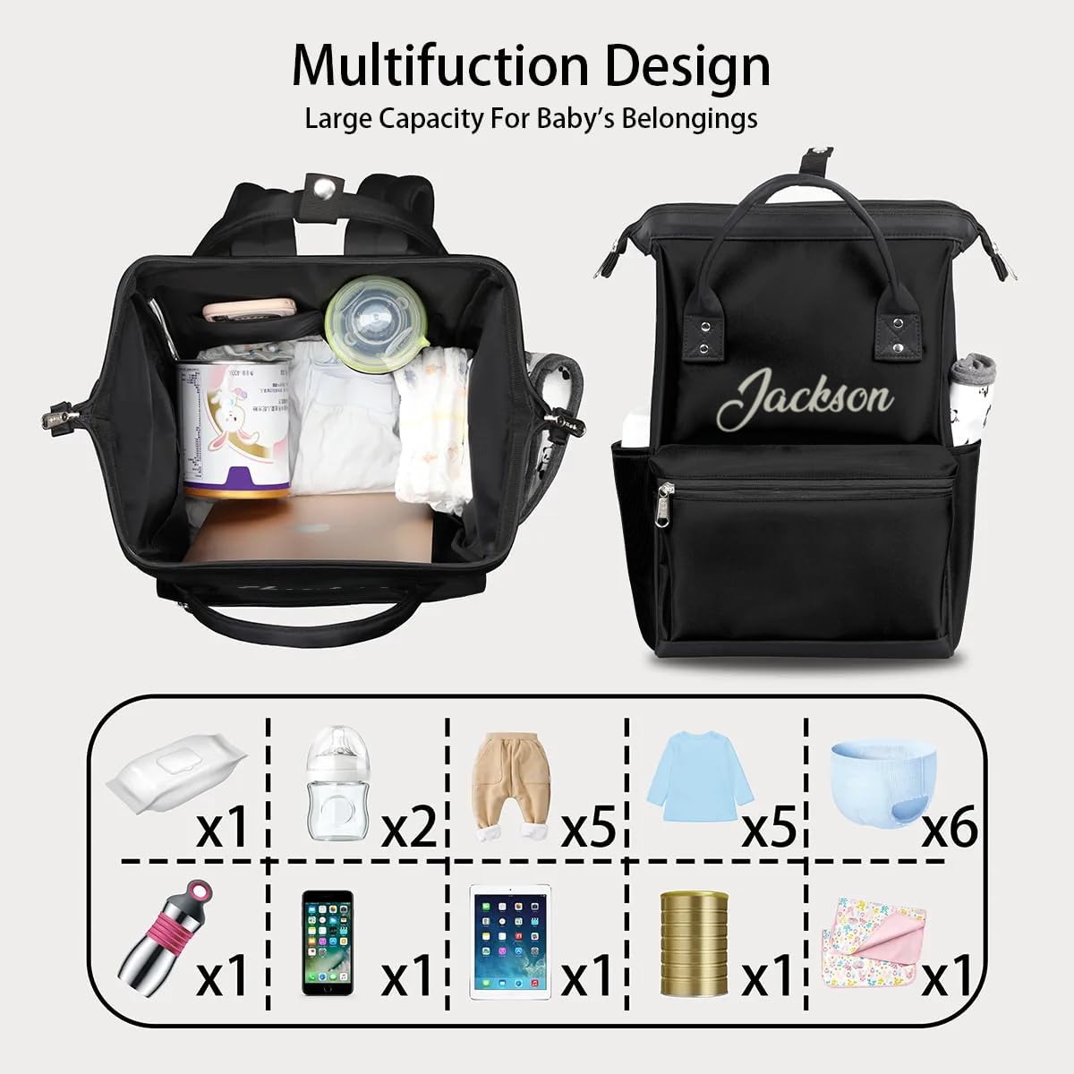A personalized diaper bag is a special gift for new parents and new babies Multifunctional and considerate design:The diaper backpack has 1 main capacity bag,2 side pockets,1 front zipper pocket,4 small storage compartments inside,multi-pocket design,side zipper,easy to put in and out.The empty baby bag can stand upright or can be carried by hand or shoulder.Thickened back and shoulder straps for more comfort.Adjustable shoulder straps accommodate users of various body shapes.Unique customized content: DIY personalized customized printing pattern design,super large capacity,durable and fashionable.Fashionable Baby Backpack - This mommy backpack has contrasting colors and beautiful prints,which can make you a beautiful mom/dad.Application occasions:This bag can be carried,held in hand or hung on a stroller,suitable for walking,shopping,traveling and other occasions with baby.If you have any questions about the product,please feel free to contact us and we will reply to you within 24 hours.