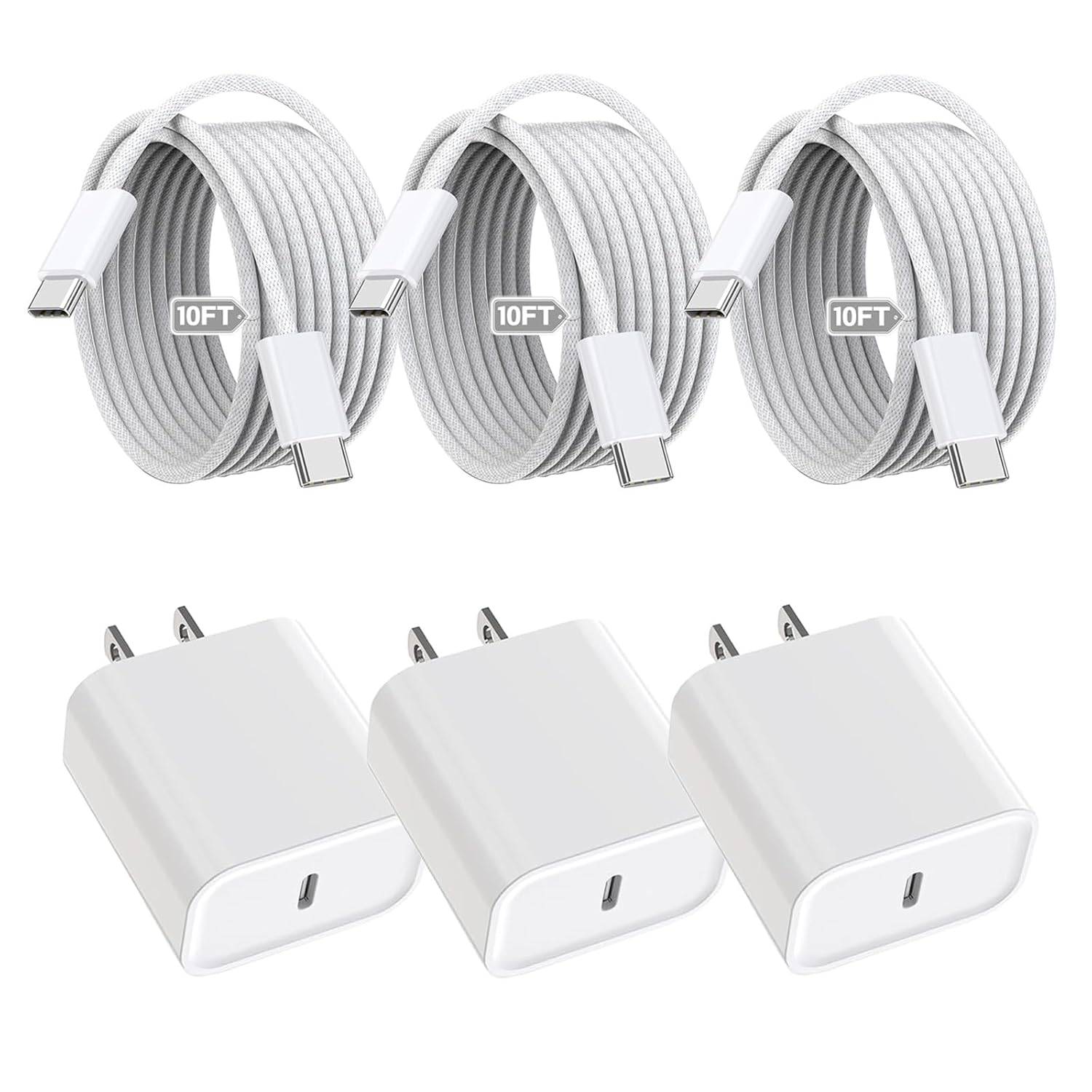 20W iPhone 17 16 15 Charger Fast ChargingOur 20W USB C iPhone 17 Charger Block Offers fast and efficient charging up to 3X faster than standard 5W charger. Fully charge your iPhone done in less time. This Fast USB C charger packs a total of 20W of power into its compact form. Keep your devices charged at home, in the office, or on the go.Fast Charger iPhone 17 USB C BlockSafe and efficient fast charger for iPhone 17/16/15 built in intelligent IC chip, automatic recognition of charging devices, equipped with multiple safety protection systems to prevent overcharging and overheating, ensuring peace of mind while charging.Type C Charger Fast Charging Cable6FT 60W fast charger USB C woven cable support fast charger and 480Mbps data syncing transfer, transfer videos, music and more between phone and laptop in seconds. The connector heads have good resistance to heat and corrosion and with tangle-free woven cable. Even after a long time, they just keep their original appearance-still brand new. And the 6FT woven charging cable length allows you charge your iPhone 17/16/15 and iPad models from long distance, makes your life more easier and convenient.Universal CompatibilityiPhone 17/17 Air/17 Pro/17 Pro MaxiPhone 16/16 Plus/16 Pro/16 Pro Max/16eiPhone 15/15 Plus/15 Pro/15 Pro MaxiPad Pro 11/13in(M4)iPad Air 11/13in(M2/M3)iPad Pro 11in (1st/2nd/3rd/4th generation)iPad Pro 12.9in (3rd/4th/5th/6th generation)iPad mini A17 Pro/iPad mini 6th generationiPad 10th generation/iPad A16iPad Air (4th/5th generation)Air Pods 4/Pro 2/Air Pods MaxWhat You Get3Pack 20W iPhone Fast Charger USB C Block3Pack 6FT Type C Charger Fast Charging Braided Cable