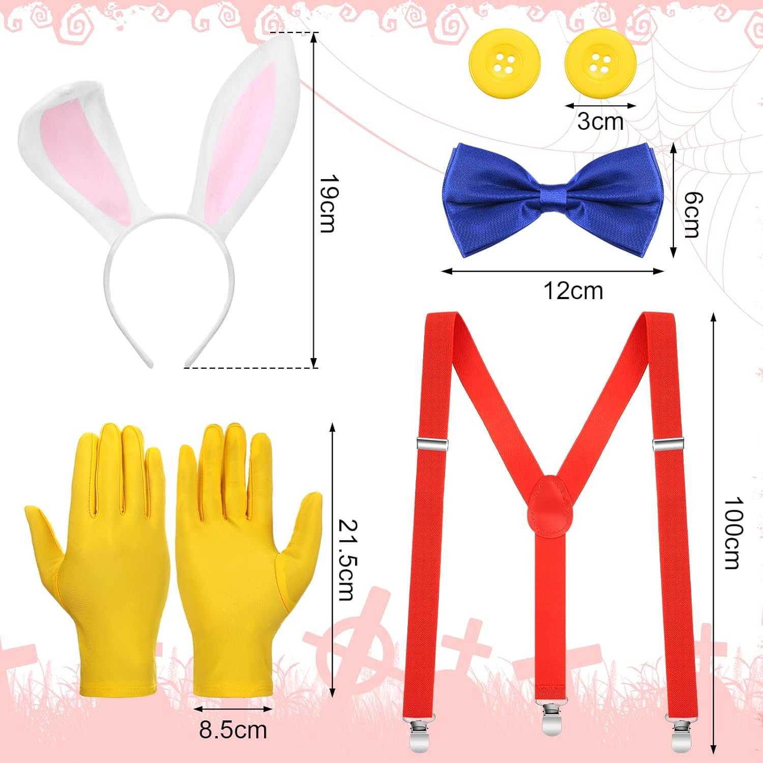 Features: You can send the red wig, plastic holder, purple gloves, yellow gloves, suspenders with clips, bow ties, 8mm earrings studs, bunny ears costume and yellow buttons to your girlfriends, wife, sisters, classmates, colleagues, to invite them to attend your holiday parties. The red wig, gloves and plastic holder, suspenders with clips, yellow gloves, royal blue bowtie, 8mm stud earrings for women, bunny ears cosplay and buttons for crafts are easy to store in your backpack or handbag, without taking up too much space. Specifications: Material: Wig: high temperature silk Ear: metal wire and fur Button: resin Props holder: plastic Earrings: titanium steel Suspenders: fabric Bow ties, gloves: polyester fiber Color: classic color Size: one size Package includes: 1 x Red wig 1 Pair of yellow gloves 1 Pair of purple gloves 1 Pair of gold ball earrings 2 x Yellow buttons 1 x Bow ties 1 x Red suspenders 1 x Plastic holder 1 x Bunny ears headband Notes: Manual measurement, please allow slight errors on size. The color may exist a slight difference due to different screen displays. Swallowing risk may exist, please keep away from little kids. Poking risk may exist, please put away from little kids.