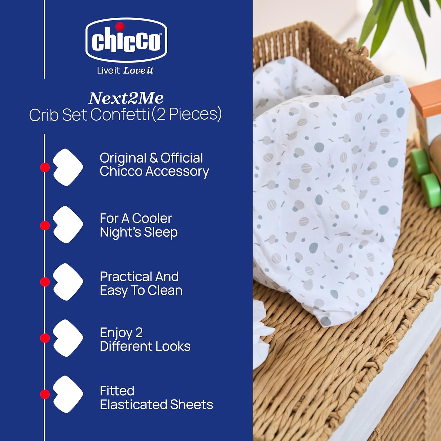 It is recommended to frequently wash baby bedding, even when it doesn't have visible stains, as it may contain dust and dirt that can irritate the skin, or leaks that can't be seen with the naked eye. The Chicco Next 2 Me Fitted Sheets are sold in a box of two, so you always have an available one while you wash the other. These Chicco Next2Me fitted sheets are the only original and official ones from Chicco that fit all the Next2Me models. They are machine washable at 40°C without worries of colours fading and can be ironed too. These baby cot sheets are made from 100% cotton, which offers the unique ability to aid temperature regulation, helping keep your little one’s sleep surface cool and hygienic. A comfortable night’s sleep guaranteed.