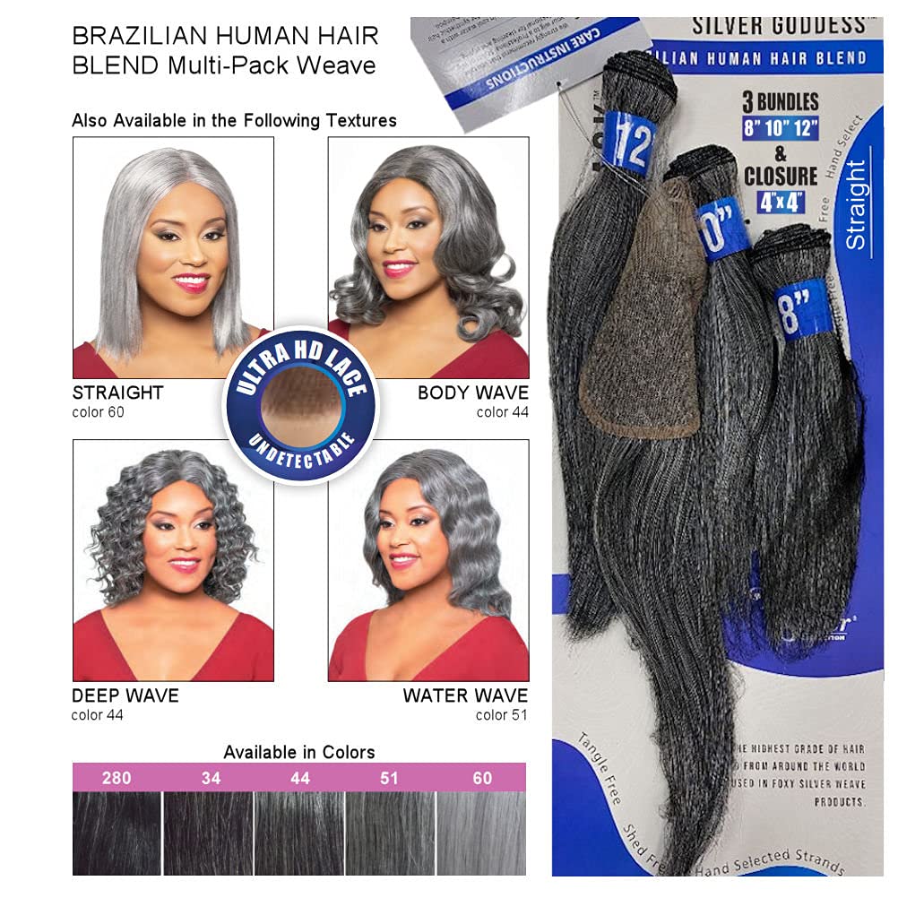 JUST ONE STRAIGHT by Foxy Silver Weave SILVER GODDESS COLLECTION. Our highest grade hand selected strands from around the world. Each pack contains 3 bundles (8, 10, & 12 inch) and one closure..ADDITIONAL INFORMATION:Type: Weave Brazilian Human Hair BlendLength: VariesStyle: StraightSize: One size fits most size.Styling required to achieve the exact look shown.COLOR INFORMATION: Color shown is (model) 60 (pack) GRAY. The color you receive may vary from the swatch shown due to your monitor, lighting and the distribution of the color fibers dictated by the style.NOTICE: This item is being described as accurately as possible and with the utmost conscientiousness on our part. We use information obtained from the manufacturer. Please feel free to ask questions prior to purchase.