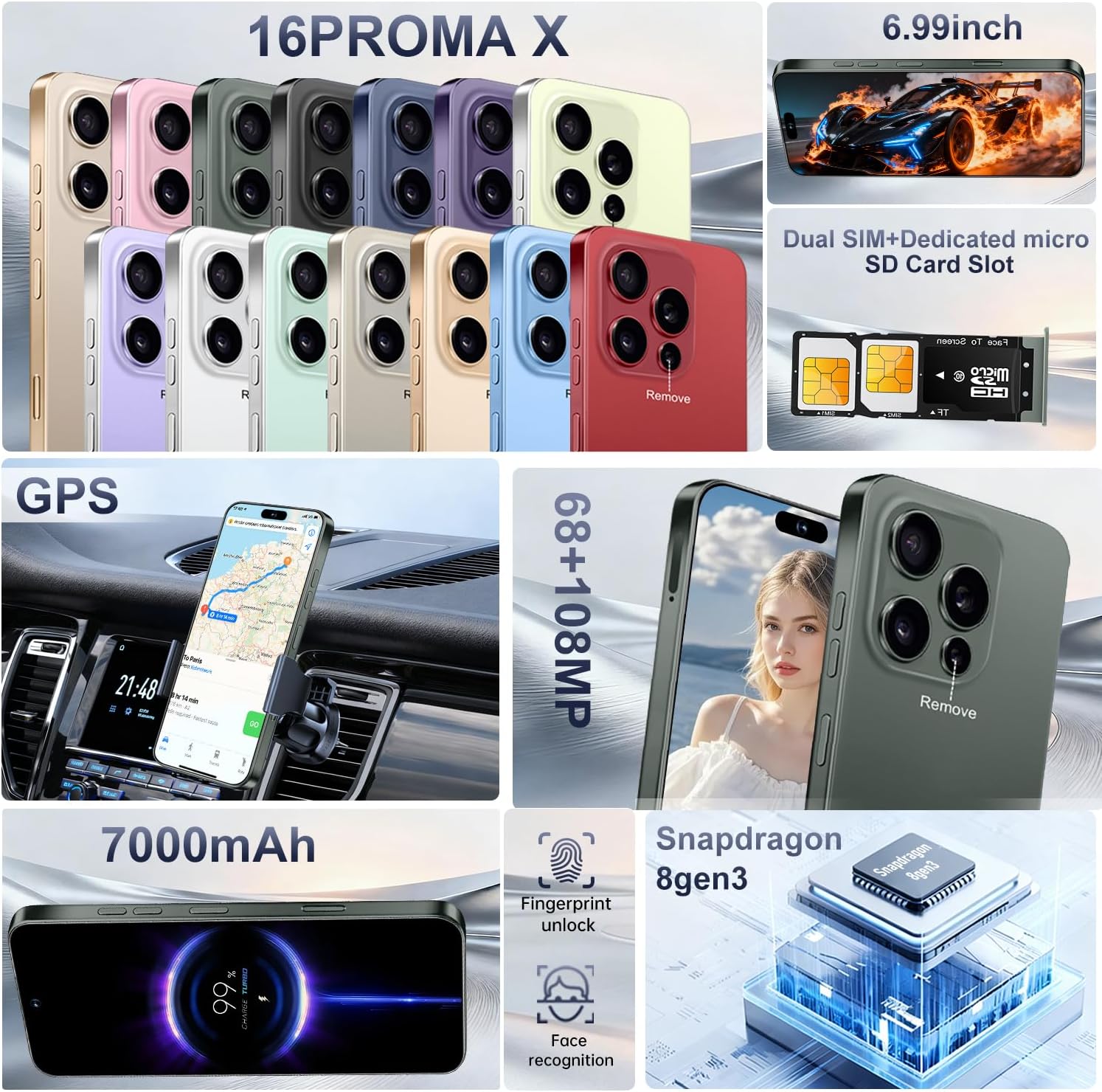 16 ProMa x Smartphone Unlocked Cell Phone, 6.99“ HD Screen5G Phone, 16+512GB phoneunlocked, Android 13.0, 68+108MP Zoom Camera, Fingerprint Button Unlock-and take photos