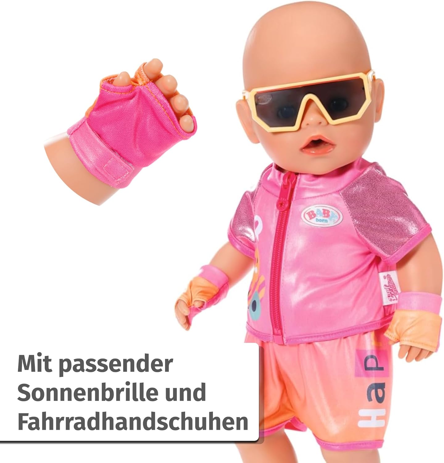 BABY born's sporty bike outfit consists of shorts and bike shirt, bike gloves and cool glasses for sharp vision on the ride. Riding a bike or trike is twice as much fun with this sporty bike outfit! The set of shorts and bike shirt in the colours pink and orange is a real eye-catcher and is rounded off with matching gloves and sunglasses. BABY born and BABY born Bear have never looked so good on a bike ride. Sporty outfit for trike and bike riders: shorts and shirt go together perfectly Additional bike accessories: goggles and bike gloves complete the look Also fits BABY born bear BABY born bike outfit 43cm consisting of matching shirt and shorts, gloves and glasses.