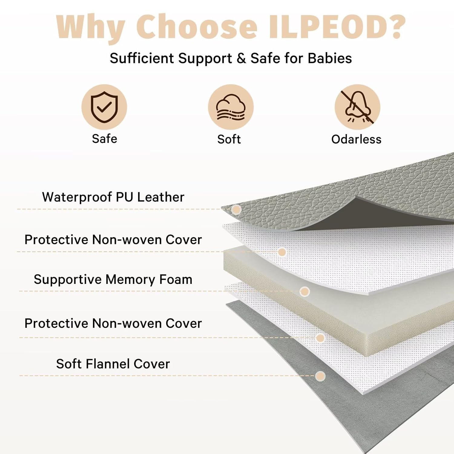 This dual-sided baby play mat is thoughtfully designed to support babies from the newborn stage through child. One side features waterproof vegan leather that resists spills,stains,and everyday messes—ideal for feeding, tummy time, and messy play.Just wipe and it's instantly clean—no washing,no stress.The opposite side is crafted with ultra-soft,warm velvet flannel,offering a cozy, skin-friendly surface perfect for lounging,rolling, reading,and bonding moments.With its high-density cushioning,the mat provides stable support and gentle impact protection for crawling and early steps.Whether used in the living room,nursery,bedroom,or outdoors,it creates a safe,comfortable,and easy-to-clean play zone.A practical essential every new parent will appreciate.