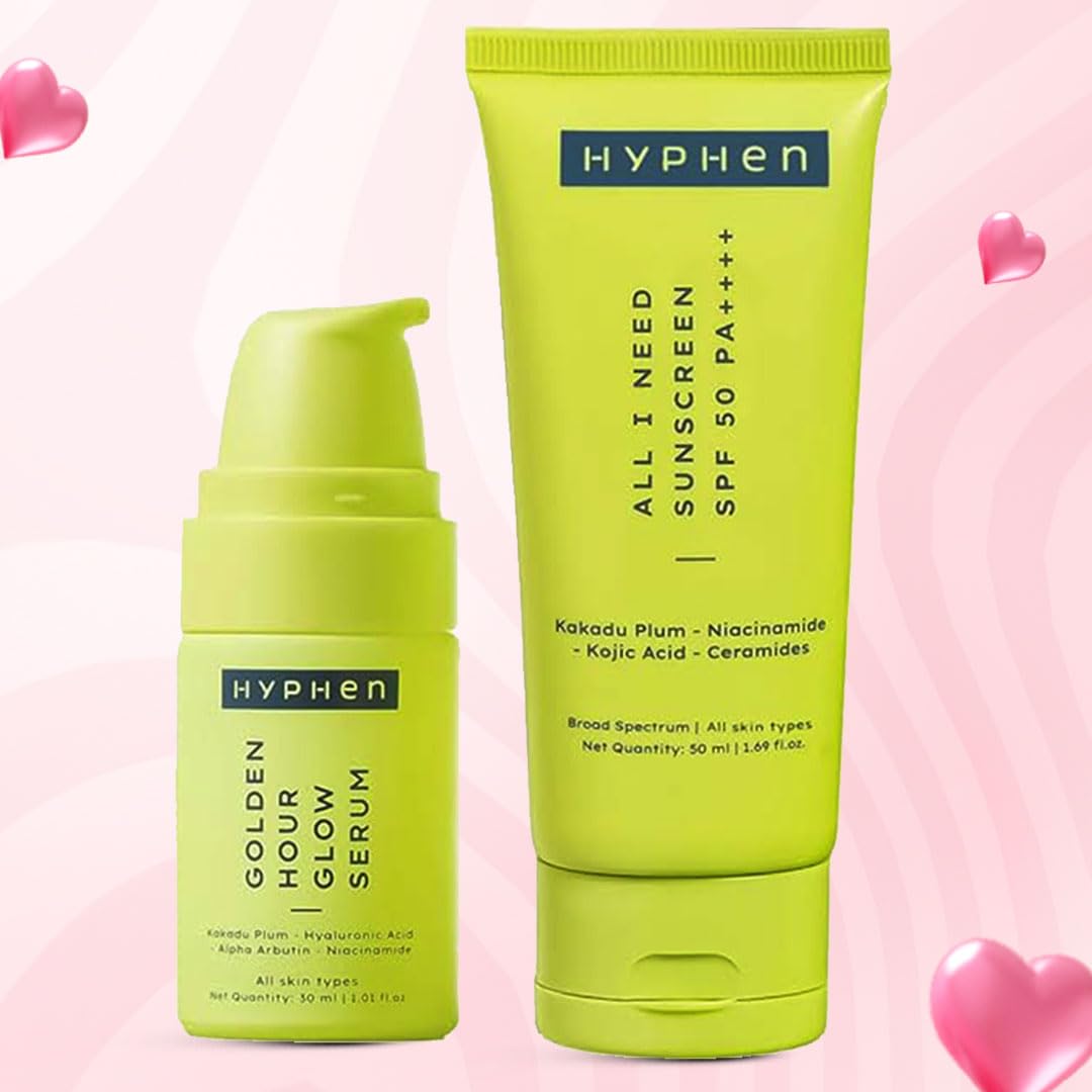 Hyphen Daily Day-Care Routine with Face Serum & Moisturizing Sunscreen SPF 50 is a powerful yet lightweight skincare duo designed to hydrate, brighten, and protect your skin every day. Enriched with Niacinamide to refine pores and improve skin tone, Hyaluronic Acid to deliver deep and lasting hydration, and antioxidant-rich Kakadu Plum to boost radiance, this routine helps enhance your natural glow while strengthening the skin barrier. The fast-absorbing face serum revitalizes and smooths the skin, while the moisturizing SPF 50 sunscreen provides broad-spectrum UVA/UVB protection without leaving a white cast or greasy finish. Suitable for all skin types, this pack of two simplifies your morning skincare routine, leaving your skin luminous, nourished, and shielded from daily sun damage.