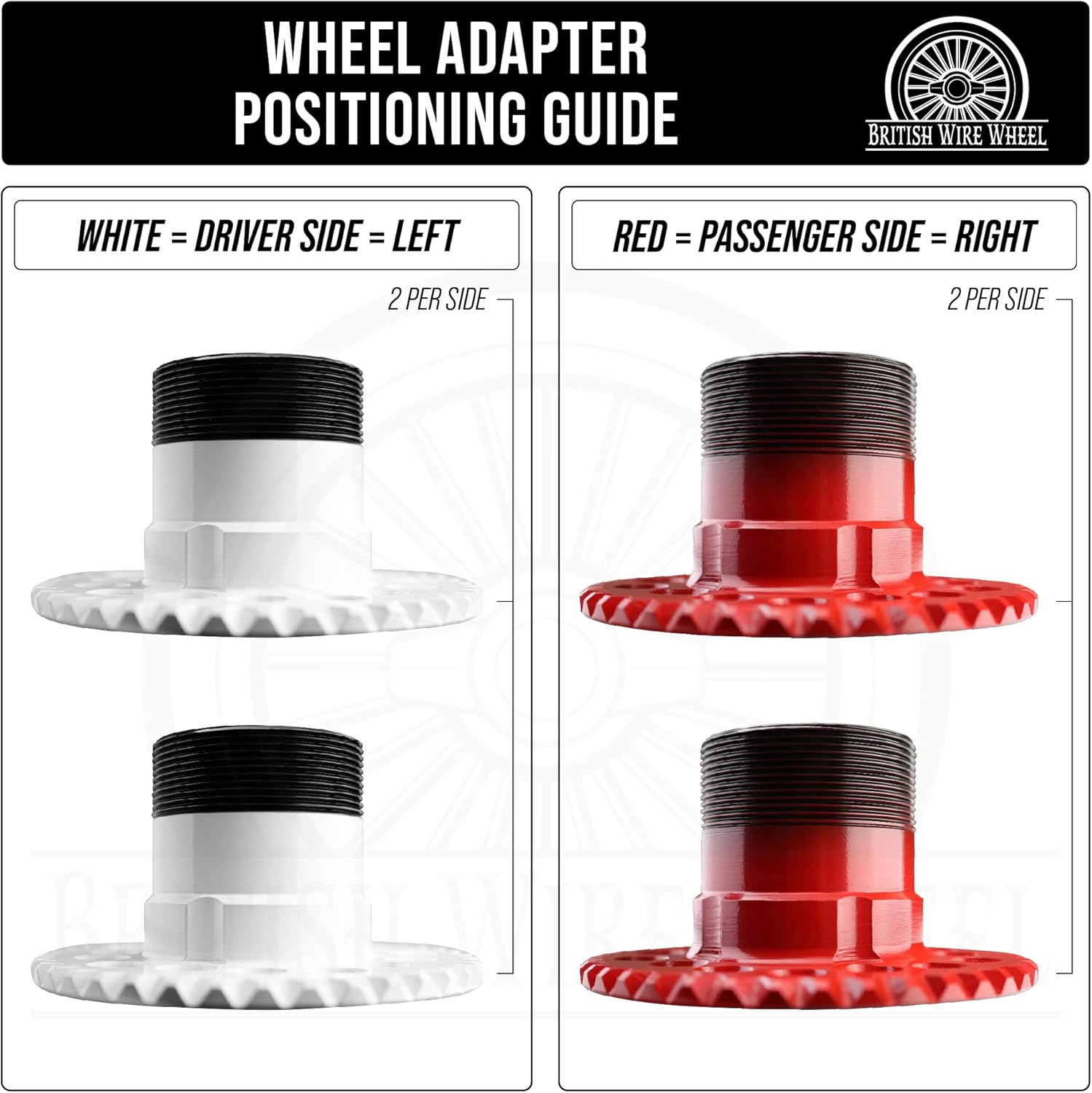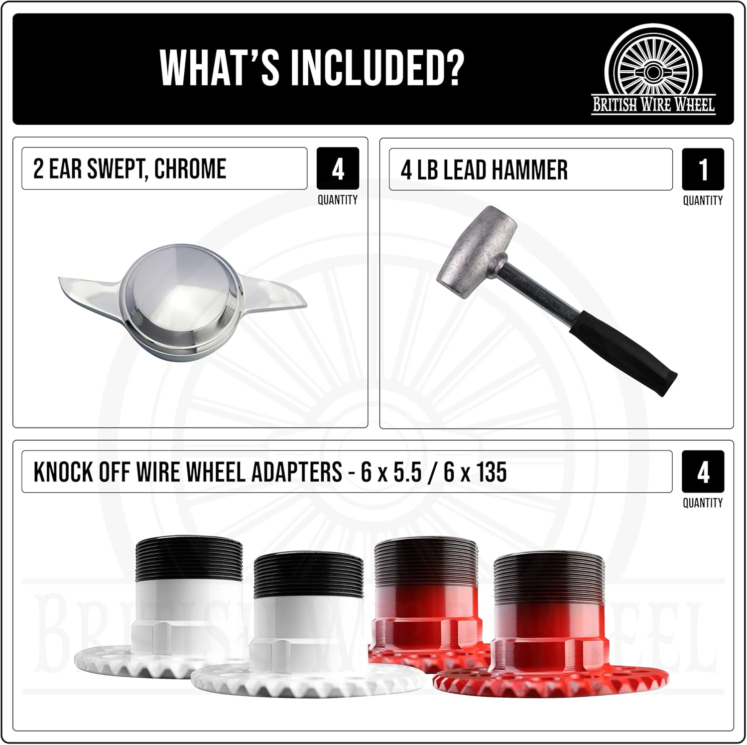 Designed with the lowrider community in mind, British Wire Wheel's knock off caps and wire wheel adapters are compatible with 13-22” knock-off style wire wheels. Our spinner caps are made of solid brass and are triple chrome plated, ensuring a stunning mirror-like finish. This bundle includes a lead hammer, so installation and removal are easy!INCLUDED IN EACH SET(4) 2 Ear Swept Chrome Knock Off Spinner Caps - 2 Right, 2 Left Sides(4) 6 Lug Adapters (6x5.5, 6x135) - 2 Right, 2 Left Sides4lb Lead HammerCOMPATIBILITYOur knock-off spinner caps and adapters are universally compatible with 13-22” knock-off style wire wheels, including Dayton Wire Wheel, Luxor, Razor, OG Wire, Truespoke, and other brands. The spinner caps are NOT compatible with OTD Dayton adapters, splined adapters, or bolt-on wire wheels.If you encounter difficulty while tightening caps onto adapters, double-check that you are utilizing the appropriate side of the cap and turning it in the direction indicated on the cap itself. Remember, "Right" corresponds to the passenger's side, and "Left" pertains to the driver's side. If you still have issues, do not force installation, as you can damage the threads of the cap and adapter. Instead, contact us for assistance - we are happy to help.SATISFACTION GUARANTEED!Discover the British Wire Wheel difference: top-tier products, unmatched customer service, and an exclusive warranty for original purchasers. When you purchase from British Wire Wheel, you choose a respected family-run brand with a strong commitment to delivering premium wire wheels and accessories at an accessible price point.