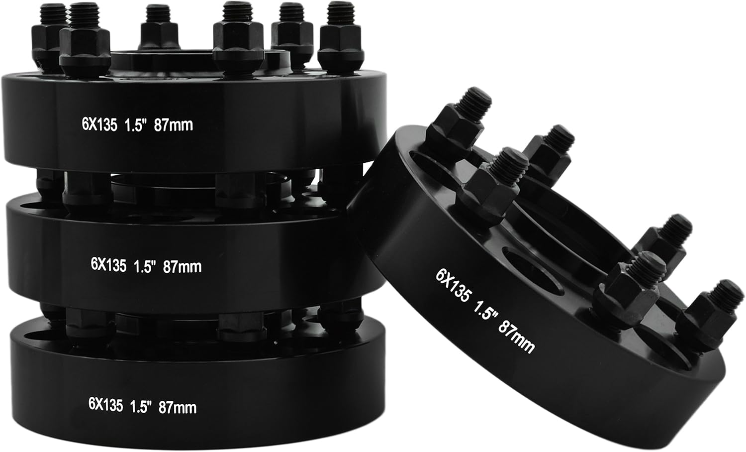 4PC Black Hub Centric Wheel Adapters Fits the Following Vehicles with 6x135 bolt pattern. Applications: 2003-2014 Ford Expedition 2004-2014 Ford F150 2003-2014 Lincoln Navigator 2006-2008 Lincoln Mark LT Important Notes - Your vehicle may have different thread pitch wheel studs than what's supplied with these wheel spacers. This means you would need to purchase different lug nuts for proper installation. Message us for more information prior to purchasing the items. - Installation should only be performed by a trained professional. - Make sure you get 6-8 FULL TURNS of the lug nuts when tightening. - Failure to follow proper procedures may cause your lug nuts to come undone while driving!!! These adapters are not like any others in the market. We tested these adapters under rough off-road terrain on our 2012 Raptor and have hold up very well. The best and last adapters you will ever need. We also carry them in 1", 1.25", 2", 2.5" & 3" Thick.