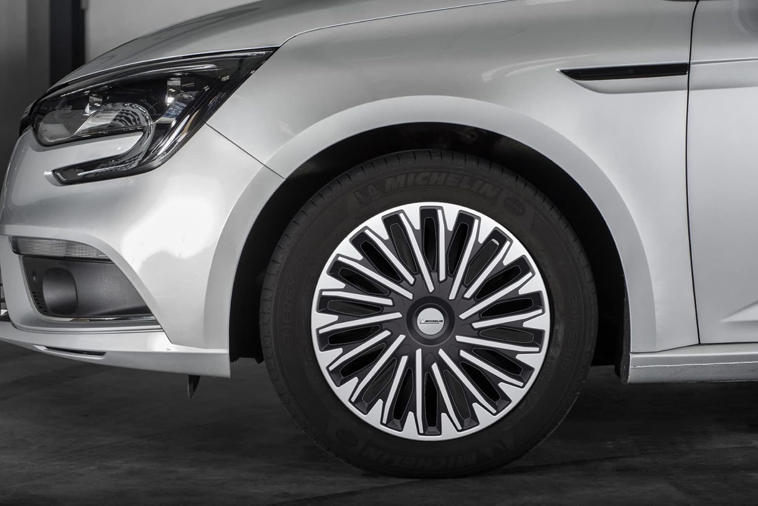 Wheel trims with integrated "Night Vision Security" system: the central headband where the Michelin logo is positioned is made of reflective material and adds safety to night journeys as the car is noticeable in the dark even laterally (reflective capacity up to 100 mt.). The patented fastening system ensures a secure hold on the wheel. Made from 100% ABS with high gloss metallic coating and chrome plated bolts.