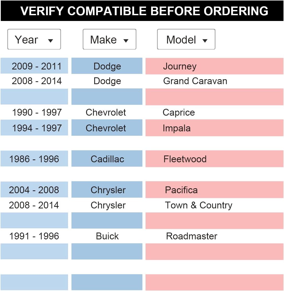 *If you don't make sure whether this item fits to you, message us with your vehicle year, maker and model, we will find the item you need.Compatible VehiclesCompatible with Chevrolet1990-1997 Caprice1994-1997 ImpalaCompatible with Dodge2009-2020 Journey2008-2019 Grand CaravanCompatible with Chrysler2004-2008 Pacifica2017-2020 Pacifica2008-2014 Town & CountryCompatible with Cadillac1986-1996 FleetwoodCompatible with Buick1991-1996 RoadmasterImportant! Please verify the bolt count, bolt circle diameter, center bore, and bolt size match your vehicle before ordering.We recommend getting this kit installed by a trained professional, but it is not necessary.We don't recommend to install the bolt nuts by electronic tool, it is best by manual.