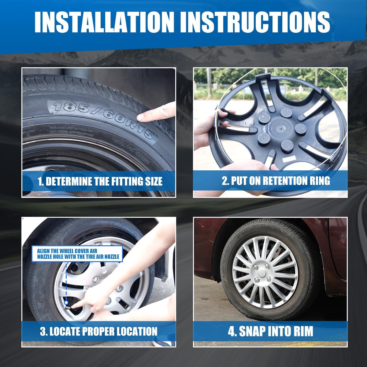 • Effortless Installation: Installing the hubcaps is a breeze, without the need for specialized tools. Simply verify tire's rim size (diameter) by locating the number following the "R" mark. Ensure your rim size is 16" for a perfect fit