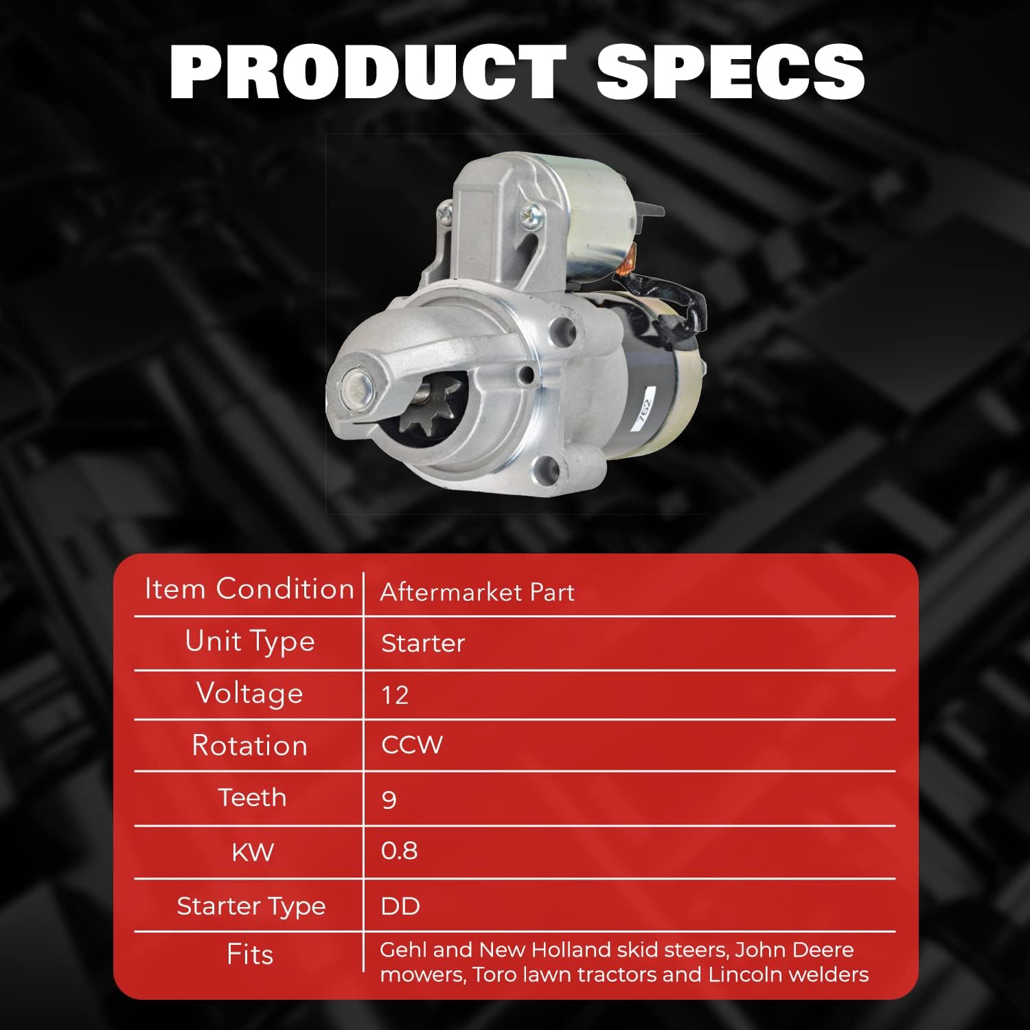**Verify part fits before purchasing**Specs:Unit Type: StarterVoltage: 12Rotation: CCWTeeth: 9KW: 0.8Starter Type: DDReplaces OEM Numbers: ARROWHEAD: SMT0002ARROWHEAD (OEM) (OLD): M2T43481, M2T43681, M2T43781CARGO: 113141, 113167J & N: 410-48163J & N (OLD): 410-48020, 410-48020RJOHN DEERE: AM104123, AM104505, AM109262LESTER: 17291MITSUBISHI: M2T32581, M2T43481, M2T43681, M2T43781, M2T43881ONAN: 191-1682-04, 191-1804-04, 191-1808-04, 191-1808-06, 191-1949-04, 191-1949-06, 191-1949-07, 191-1949-08REMY LIGHT DUTY: 69208TORO: 71-6040VALEO: TM000A21901Compatible With/Replacement For: GEHL: 3310JOHN DEERE: F910LINCOLN WELDER: Onan EngineNEW HOLLAND: L250 1984-1999ONAN: P-216 / 218 / 220 / 224, P-227STEINER: 410TORO: 316-8 Garden Tractor 1992, 416-8 Garden Tractor 1989-1997, 416-H Garden Tractor 1992-1997, 520-H Garden Tractor 1991-1997, 724-Z Tractor 1991-1992