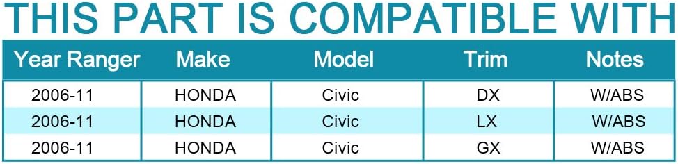 About Us:IRONTEK is a fast growing auto parts distributor in the US that offers a wide range of replacement auto parts. We strive for excellence and believe high quality and a great reputation are crucial to our business. All of the auto-parts we offer are manufactured using the latest international equipment and state-of-the-art technology to ensure you get the best. The importance of wheel bearings: Hub assembly is a critical components, it allow the wheels to spin freely and at the desired speed. They’re also responsible for keeping the wheels attached to the vehicle. As the bearings begin to wear out or become damaged, they impact the wheels ability to spin smoothly, freely, and securely. When this happens your vehicle will become shaky, and your wheels will not be secure. Part Fitment Information: 2006-11 for HONDA Civic DX LX GX w/ABS
