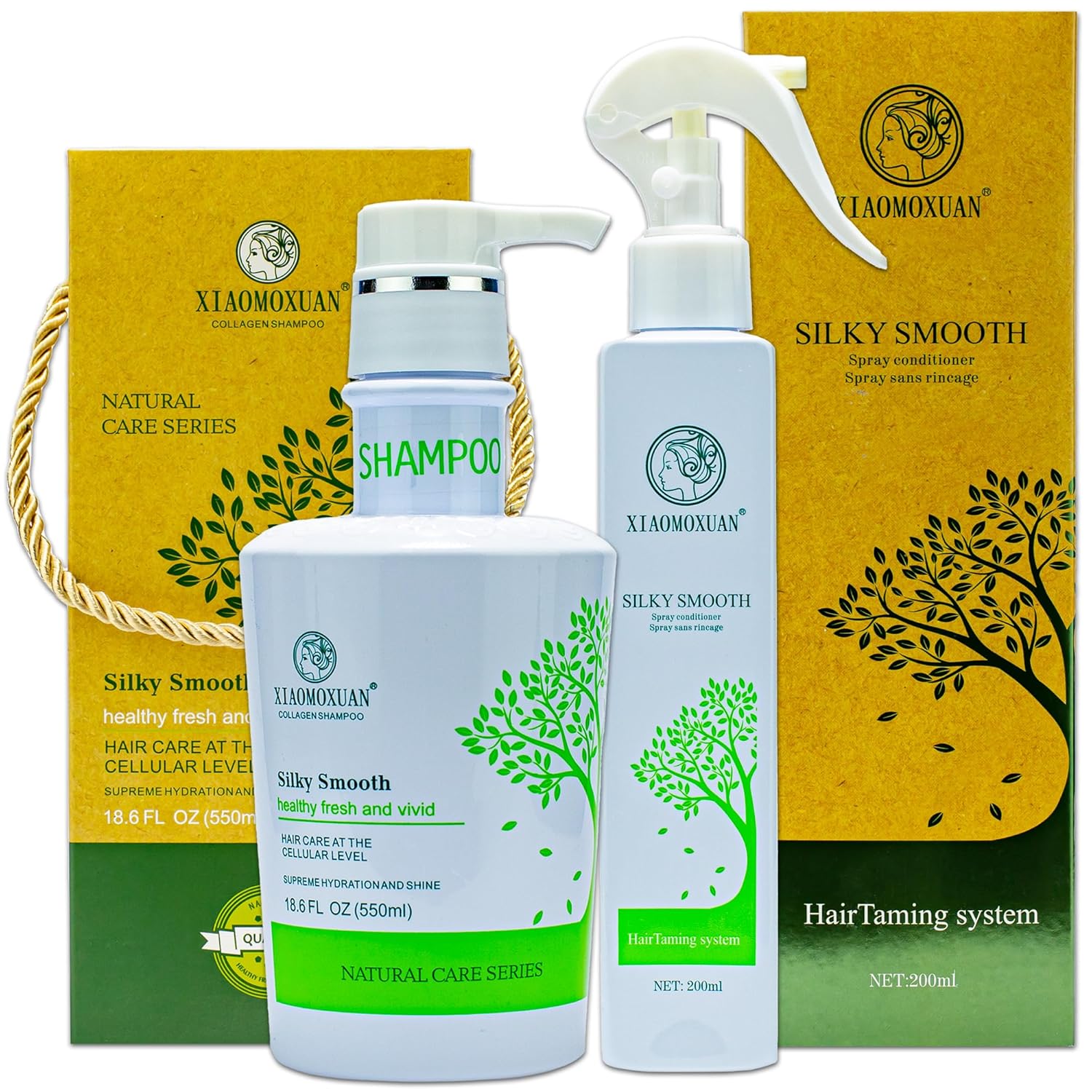 Xiaomoxuan collagen shampoo is formulated from organic tea tree leaves and collagen. It restores the natural beauty of your hair, working on its’ structure at the cellular level. It provides hair with a maximum amount of precious moisture and securely seals it inside. The locks become strong, supple, smooth, acquiring shine and silkiness. The collagen perfectly copes with dryness while rejuvenating the strands. This shampoo is an ideal product to preserve the beauty of long hair and keep the ends from splitting. Suitable for all hair types.Method of application: Apply evenly to wet hair and massage throughout. Rinse and repeat if desired.Volume: 550-ml (milliliters), 18.6-fl oz (fluid ounces)Xiaomoxuan leave-in natural shine conditioner for hair repair. It is a light and gentle product for excellent hair smoothing and the elimination of excessive frizziness. Xiaomoxuan leave-in conditioner is a hair sun protection spray detangler which creates a thin film over the entire length of your hair, which acts as efficient protection against sea and chlorinated water, as well as overheating and moisture loss using blow dryers and hot tools, hair breakage treatment. The hair becomes less frizzy, more shiny and manageable after the application.Method of application: Shake bottle well. Apply a sufficient amount of the product to pre-washed towel-dried hair. Spread it over the entire length. Proceed with styling. The spray can be used during the day to moisturize dry hair.Volume: 200-ml (milliliters), 6.76-fl oz (fluid ounces)Ingredients: Aqua/Water, Organic Tea Tree Leaf Base, Vanillin, Transparent Acid, Collagen, Organic Plant Amino Acids, Polyethylene Glycol Cetyl/Stearyl, N-Lauryl Sarcosine Sodium Salt, PCA, Citric Acid Monohydrate, Copolymer, Hydroxyethyl Urea, Silicone, Dimethicone Crosspolymer, Undeceth-11, Unsaponifiables, Butylphenyl Methylpropional, Fragrance/Parfum.Expiry date: See packages