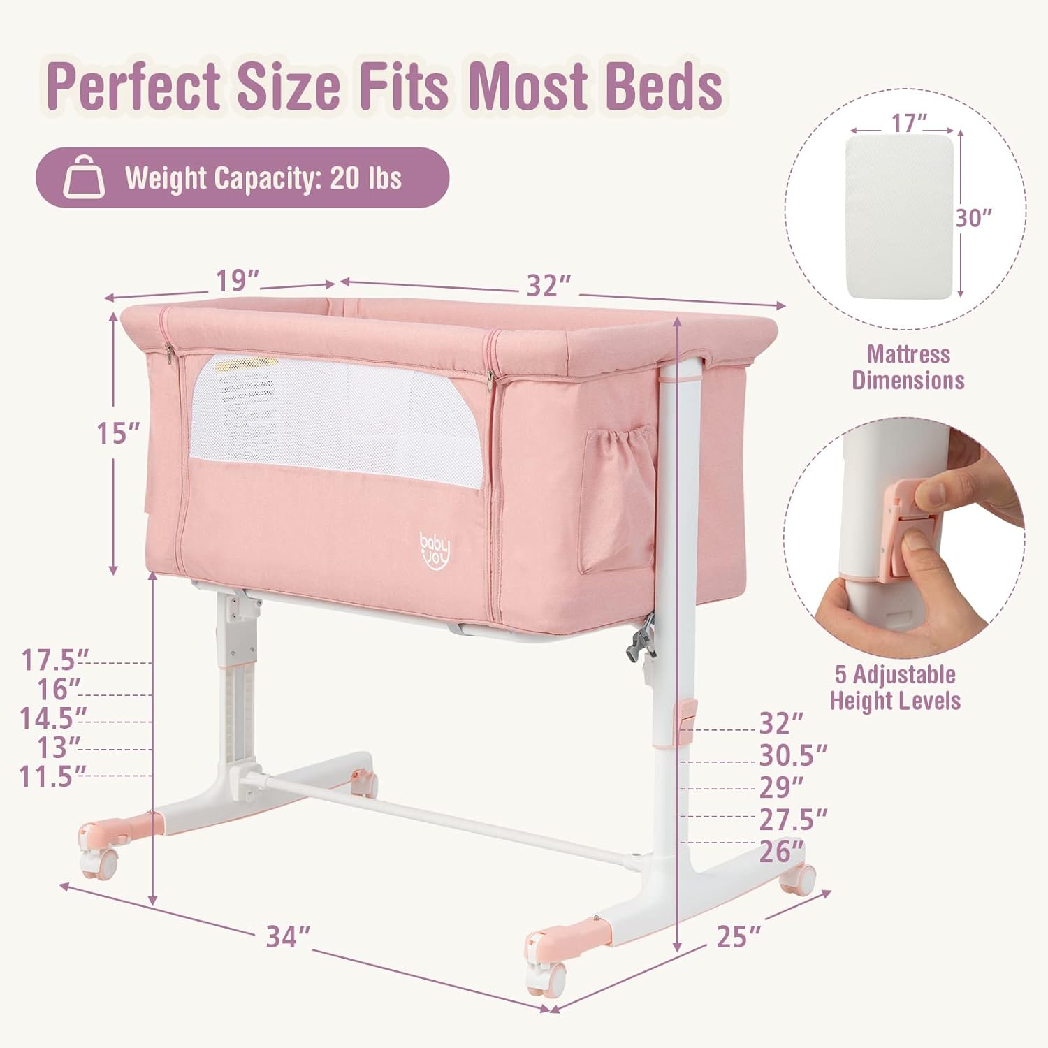 Description:Our 3-in-1 baby bassinet is a must have for every newborn parent!The rugged steel tube structure, soft mattress and breathable mesh sides provide a stable and secure sleeping spot. You can simply hold the button and lift the wheels up to transform it into a cradle. The 5-level adjustable height can fit most adult beds. And the easy-open side panel offers quick access to comfort or nurse the baby. 4 smooth rolling wheels with safety brakes make the bedside crib easy to move from room to room. What's more, the carry bag is provided for convenient storage and transportation.Features:Easily switches among beside mode, cradle mode and standalone crib modeHeavy duty steel tube frame ensures strong stability and load capacityEquipped with a detachable sidebar for taking better care of the baby5 adjustable heights and the incline design meet different needsBreathable mesh sides offer better ventilation and visibilityThe soft and comfortable mattress ensures a good night's sleepRetractable feet make the crib closer to your bed and babyEasily attach and secure to the adult bed with the included strapsSpecifications:Color: Beige/Grey/PinkMaterial: Steel, Plastic, Linen Fabric, 210D Oxford FabricOverall Dimension: 34" x 25" x 26"/28"/29"/30"/32" (L x W x H)Size of Mattress: 30" x 17" x 1" (L x W x Thickness)Height from the Ground to the Mattress: 12"/13"/15"/16"/17"Net Weight: 17.6 lbs/ 8 kgWeight Capacity: 20 lbs /9 kgRecommended Ages: 0-5 MonthsPackage Includes:1 x Baby Beside Sleeper1 x Travel Bag2 x Straps1 x Instruction