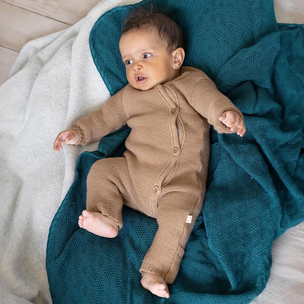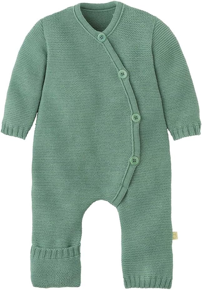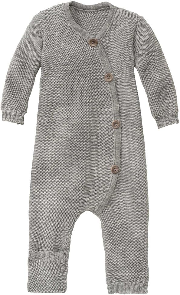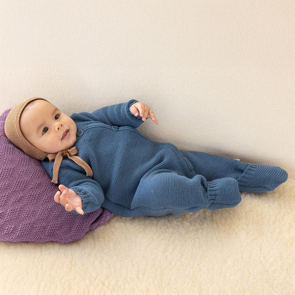 Welcome your newborn with unparalleled warmth and comfort. The baby organic merino wool knitted overall is meticulously crafted from the finest 100% organic merino wool, ensuring your little one stays cozy and secure. Designed for babies from newborn to 12 months, this thermal wool knit baby coverall combines unparalleled softness, flexibility, and natural warmth. Our long sleeve one-piece jumpsuit romper features premium quality wool, renowned for its excellent heat retention. This thermal overall is naturally soft, breathable, and temperature-regulating, keeping your baby comfortable in any season. The purl stitch fabric offers elasticity and breathability, allowing your baby to move freely and comfortably—perfect for those first kicks and wiggles. Dressing your baby is effortless with the four large boxwood buttons, which add both functionality and charm. Wide, soft cuffs on the sleeves and legs ensure the romper stays in place, while fold-over leg warmers provide extra warmth for your baby's feet, eliminating the need for socks. This GOTS-certified overall is made from organic merino wool with natural self-cleaning properties, requiring less frequent washing. Simply air out or spot clean for freshness, making it perfect for conscientious parents. Whether it's a cozy day at home or an outing in cooler weather, the merino wool overall keeps your baby warm and stylish. Its timeless design makes it a perfect gift for new parents, baby showers, or an essential addition to your baby’s wardrobe. Material: 100% organic merino wool (GOTS certified). Colors: classic colors suitable for boys, girls, and gender-neutral options. Made in Germany. Experience the unmatched warmth and comfort of organic merino wool, ensuring your little one is wrapped in nature's best.
