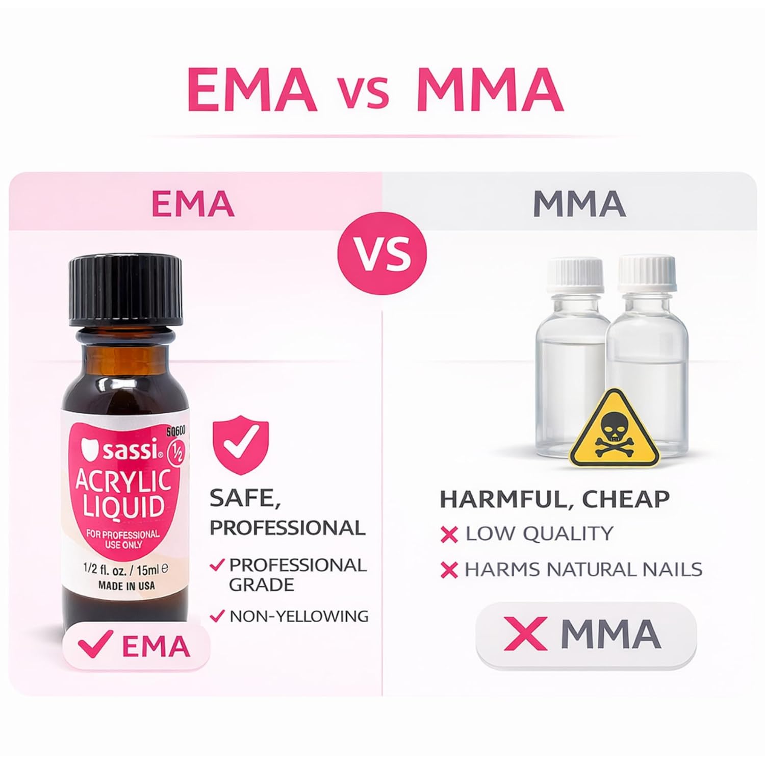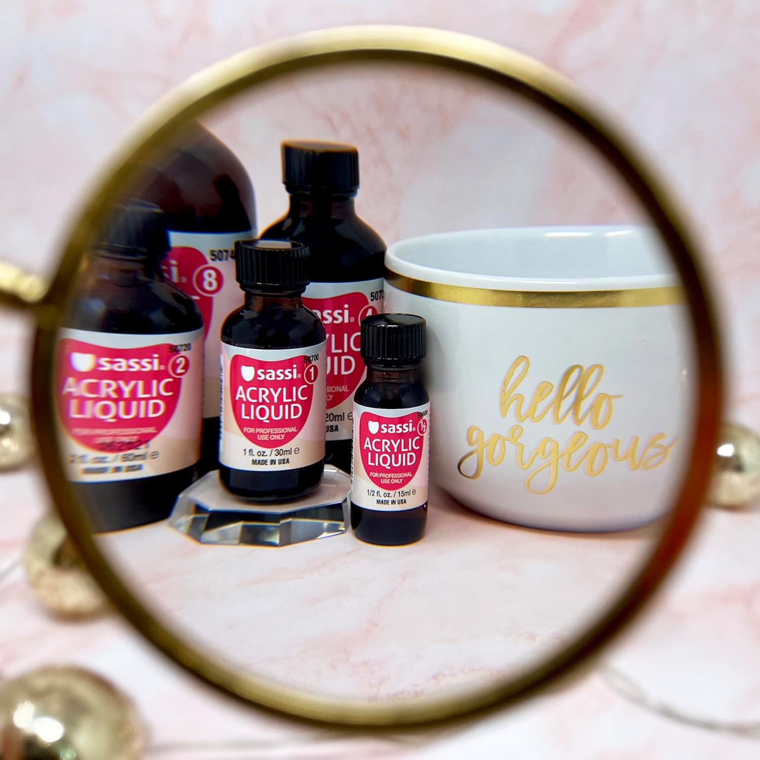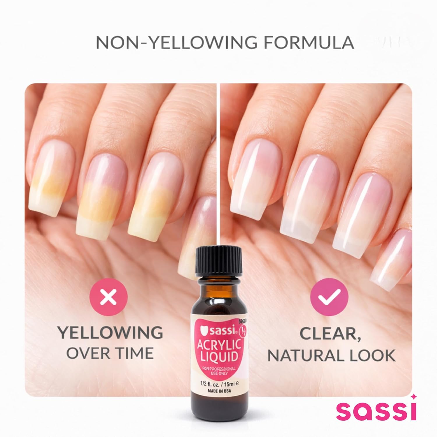 Sassi Acrylic Liquid Monomer is a professional EMA-based system designed for strong, consistent nail application. Made in the USA and formulated to resist yellowing, it delivers clean, durable results with excellent adhesion and flexibility. The self-leveling formula allows smooth application and better control, making it ideal for sculpting, overlays, and extensions. Designed for use with Sassi acrylic powders, this system provides reliable performance for both salon professionals and at-home users seeking professional-quality results.