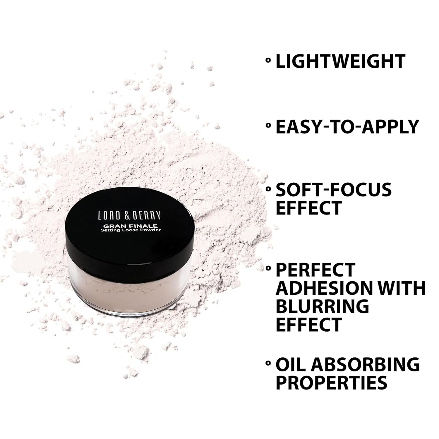 Product Description Introducing the Gran Finale Setting Loose Powder by Lord and Berry, an exceptional addition to your makeup routine. This translucent setting powder acts as an invisible, wonderful veil on your skin, providing a lightweight yet effective finish. The loose powder has been designed for easy application, blending effortlessly to set your makeup for a long-lasting, flawless appearance. Brand Story Lord & Berry models MAKEUP AS FASHION. Stylishly based in Milan and creates the BEST OF BACKSTAGE BEAUTY. Known as THE LIPS & EYES MAKEUP SPECIALIST. Delivers MODERN QUALITY, SIMPLE ELEGANCE with FASHON FORWARD COSMETICS.