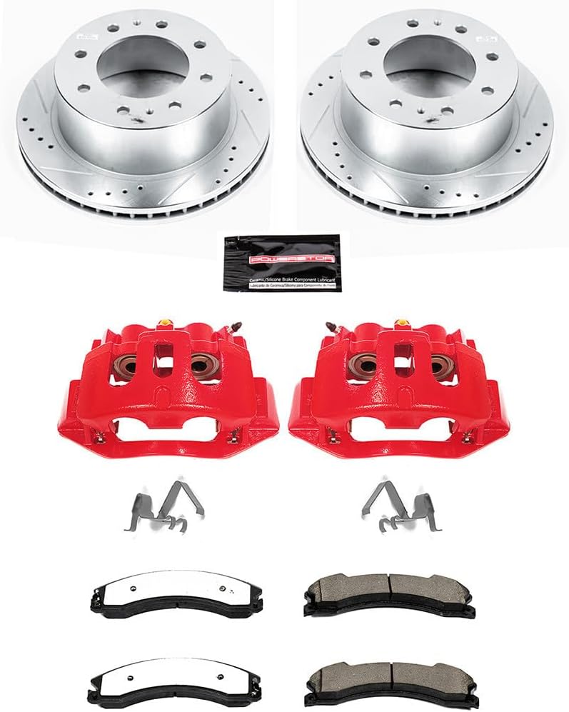 Product: PowerStop Z36 Extreme Truck & Tow Brake Pads & Rotor Kit with Red Powder Coated CalipersWhat’s in the Box: This premium Z36 brake kit upgrade includes Z36 Carbon-Fiber Ceramic Brake Pads, Drilled & Slotted Performance Brake Rotors, Red Powder Coated Calipers, and Stainless-Steel Installation Hardware.Engineered For:Heavy Towing & Hauling – Ideal for campers, work trailers, boats, and medium duty fleetMountain & Severe-Duty Driving – Designed to resist brake fade on long descentsModified Trucks & SUVs – Perfect for lifted suspsension vehicles or larger wheel/tire setupsComponent Breakdown:Z36 Carbon-Fiber Ceramic Brake Pads - Formulated with a low-dust ceramic compound reinforced with carbon fibers for extreme stopping power. Stainless-steel shims help reduce noise and vibration while maintaining everyday drivability.Drilled & Slotted Performance Rotors - Manufactured from G3000 metallurgy and built to strict OE tolerances. Precision-drilled holes and slots vent heat, remove gas and debris, and maintain consistent braking performance under extreme conditions. Silver Zinc Dichromate plating protects against rust and corrosion.Red Powder Coated Calipers - The iconic performance red calipers not only look great behind custom wheels but are easy to clean and resist corrosion, extending the life of the braking system.Easy, Bolt-On Installation: This is a direct-fit replacement designed to install with no modifications required. All necessary hardware is included for a straightforward install using factory mounting locations.This Item Fits:Rear: 2015-19 Chevrolet Silverado 2500 HD Rear: 2016-19 Chevrolet Suburban 3500 HD Rear: 2015-19 GMC Sierra 2500 HD
