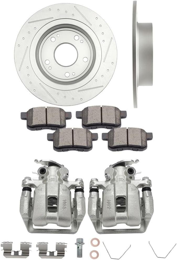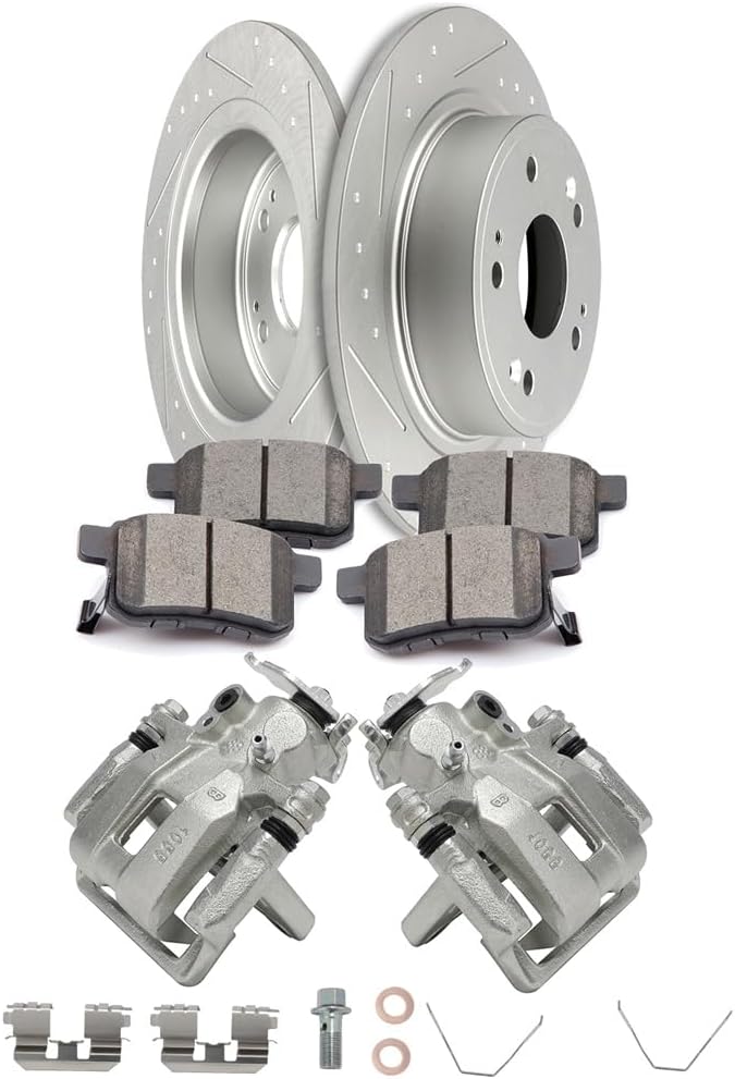 Specifications:Rear Brake CalipersBrake Piston Count:1Piston Material: IronBracket: With BracketBleeder Port Size:M10 x 1.25-6HInlet Port Size:M10 x 1.0-6HPiston Size:1.497inchRear RotorsLug Count: 5Outer Diameter: 281.6mmHeight: 48.8mmCenter Hole Diameter: 64.1mmPitch Circle Diameter: 114.1mmThickness: 9mmMinimum Thickness: 8mmSolid or Vented: SolidKit Includes:2* Rear Brake Calipers2* Rear Drilled & Slotted Brake Rotors4* Rear Ceramic Brake PadsCompatibility:2009-2014 For Acura TSX 2.4L2010-2014 For Acura TSX 3.5L2008-2012 For Honda For Accord 2.4L2008-2012 For Honda For Accord 3.5L