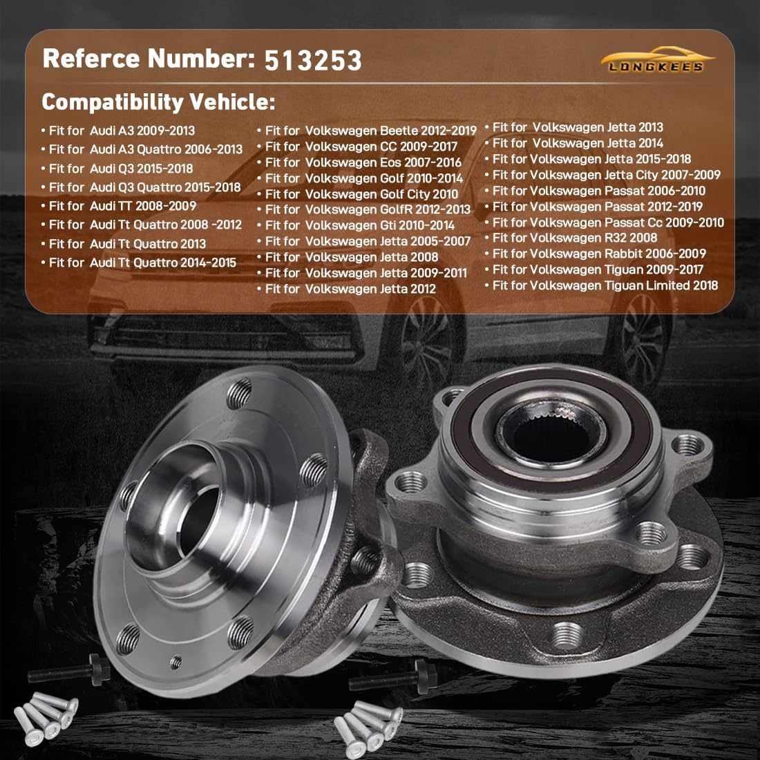 This front wheel hub and bearing assembly set is designed as a direct replacement for factory-installed units on select FIT VW and FIT Audi vehicles listed below. Vehicle Compatibility: FIT 2005–2018 VW Jetta front wheel hub FIT 2006–2019 VW Passat front wheel hub FIT 2010–2014 VW GTI front wheel hub FIT 2009–2017 VW Tiguan front wheel hub FIT 2012–2018 VW Beetle front wheel hub FIT 2006–2013 Audi A3 Quattro front wheel hub FIT 2015–2018 Audi Q3 front wheel hub Product Configuration: 2-piece front wheel hub and bearing assembly set 4-bolt mounting flange 5-lug wheel alignment geometry Integrated magnetic ABS encoder ring Materials & Construction: Manufactured from precision-hardened GCr15 bearing steel with induction-treated internal raceways. Exterior components feature factory-style surface treatment suitable for long-term vehicle use. Lubrication & Sealing: Pre-filled high-temperature grease and factory-style sealing structure designed to match original bearing configuration. Installation Notes: Direct-fit replacement using factory mounting locations. Proper installation procedures and torque specifications should be followed. Not compatible with 3-bolt flange models or rear axle positions. Please verify vehicle year and axle configuration before purchase.