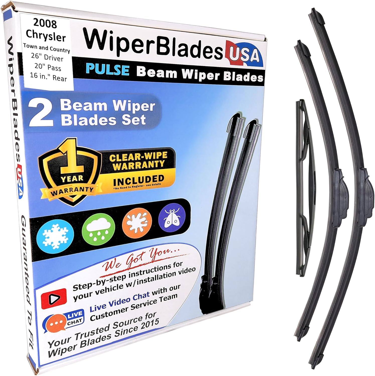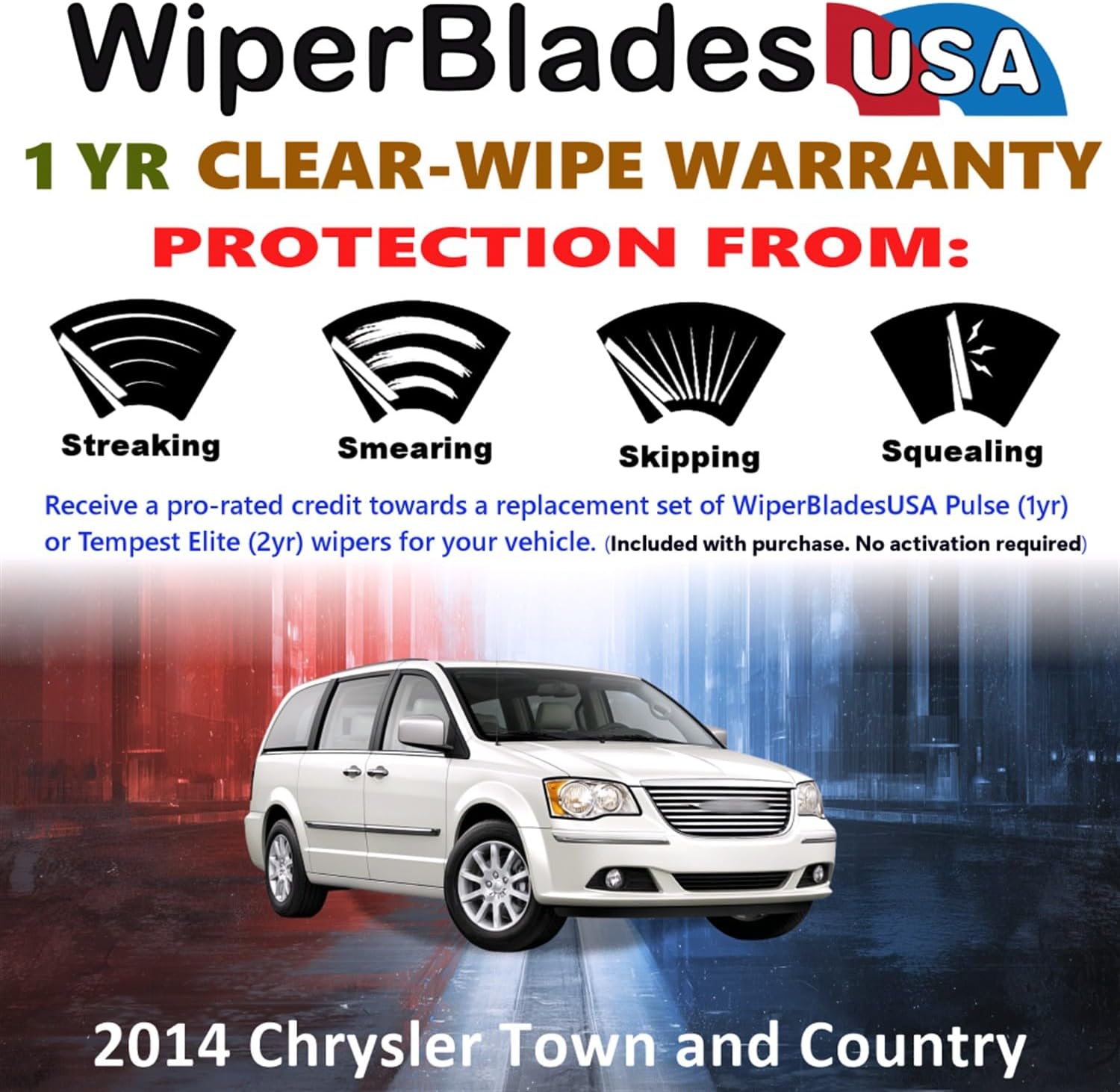 Pulse Beam wiper blades wipers set +Trico ExactFit Rear wiper compatible with Chrysler Town and Country 2014WiperBladesUSA Beam Wiper Blades - Durable Flexible Beam Blade These WiperBladesUSA® beam wiper blades contour to the curvature of your windshield to provide even wiping pressure along the full length of the blade. These wiper blades have a 1 year Wiper Wear Warranty included. Meaning if they stop keeping you safe you get a credit towards a fresh pair. (See Details) When WiperBladesUSA says "We Got You" we want to make sure you keep good working wipers on your car. Every day. All the time. These beam wiper blades are designed to be compatible with Chrysler Town and Country 2014 Virtually streak-free visibility Great wipers to have in rain, sleet and snow1 year "Clear-Wipe Warranty"Smooth, chatter-free wipe is a result of the specially blended teflon rubber bladeEnhanced flexibility and grip from the durable, rubber-encased substructureSignificant noise reduction and wind lift through a built-in aerodynamic spoiler to keep the wiper on the windshield at freeway speedsAll weather tough wiper blades with a synthetic rubber squeegee that will withstand even the most extreme weather conditionsPrevents ice and snow build-up through the elimination of exposed metal components. Easy Installation: Included in the bundle are directions (w/video) to simple and easy to use step-by-step installation on to your vehicle