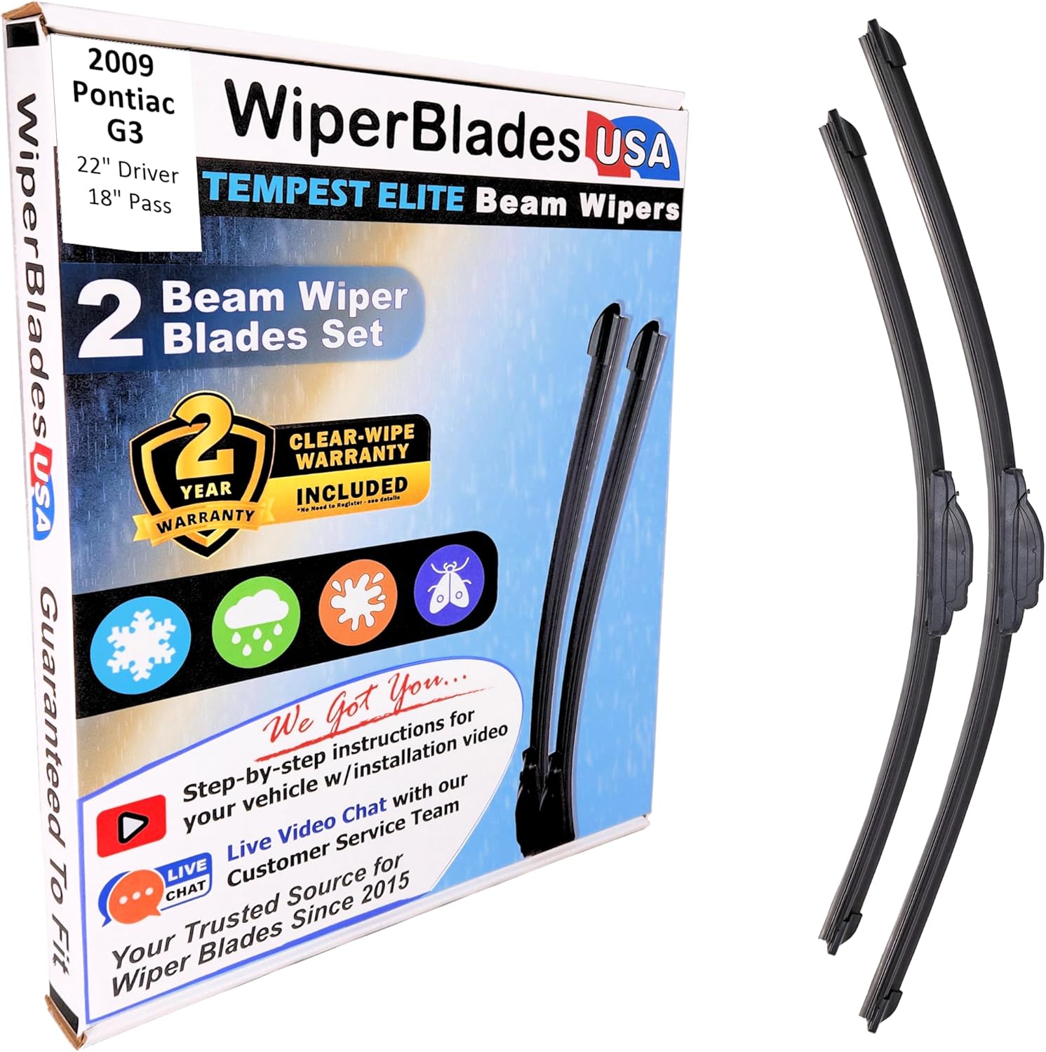 Tempest Elite Beam wiper blades wipers set is compatible with Pontiac Solstice 2006WiperBladesUSA Beam Wiper Blades - Durable Flexible Beam Blade The WiperBladesUSA® wiper blade contour to the curvature of your windshield to provide even wiping pressure along the full length of the blade. These wiper blades have a 2 years Wiper Wear Warranty included. Meaning if they stop keeping you safe you get a credit towards a fresh pair. (See Details) Don't get caught in heavy rain without this durable beam wiper blades are designed to be compatible with your Pontiac Solstice 2006 Virtually streak-free visibility Great wipers to have in rain, sleet and snow2 years "Clear-Wipe Warranty"Smooth, chatter-free wipe is a result of the specially blended teflon rubber bladeEnhanced flexibility and grip from the durable, rubber-encased substructureSignificant noise reduction and wind lift through a built-in aerodynamic spoiler to keep the wiper on the windshield at freeway speedsAll weather tough wiper blades with a synthetic rubber squeegee that will withstand even the most extreme weather conditionsPrevents ice and snow build-up through the elimination of exposed metal components. Easy Installation: Included in the bundle are directions (w/video) to simple and easy to use step-by-step installation on to your vehicle