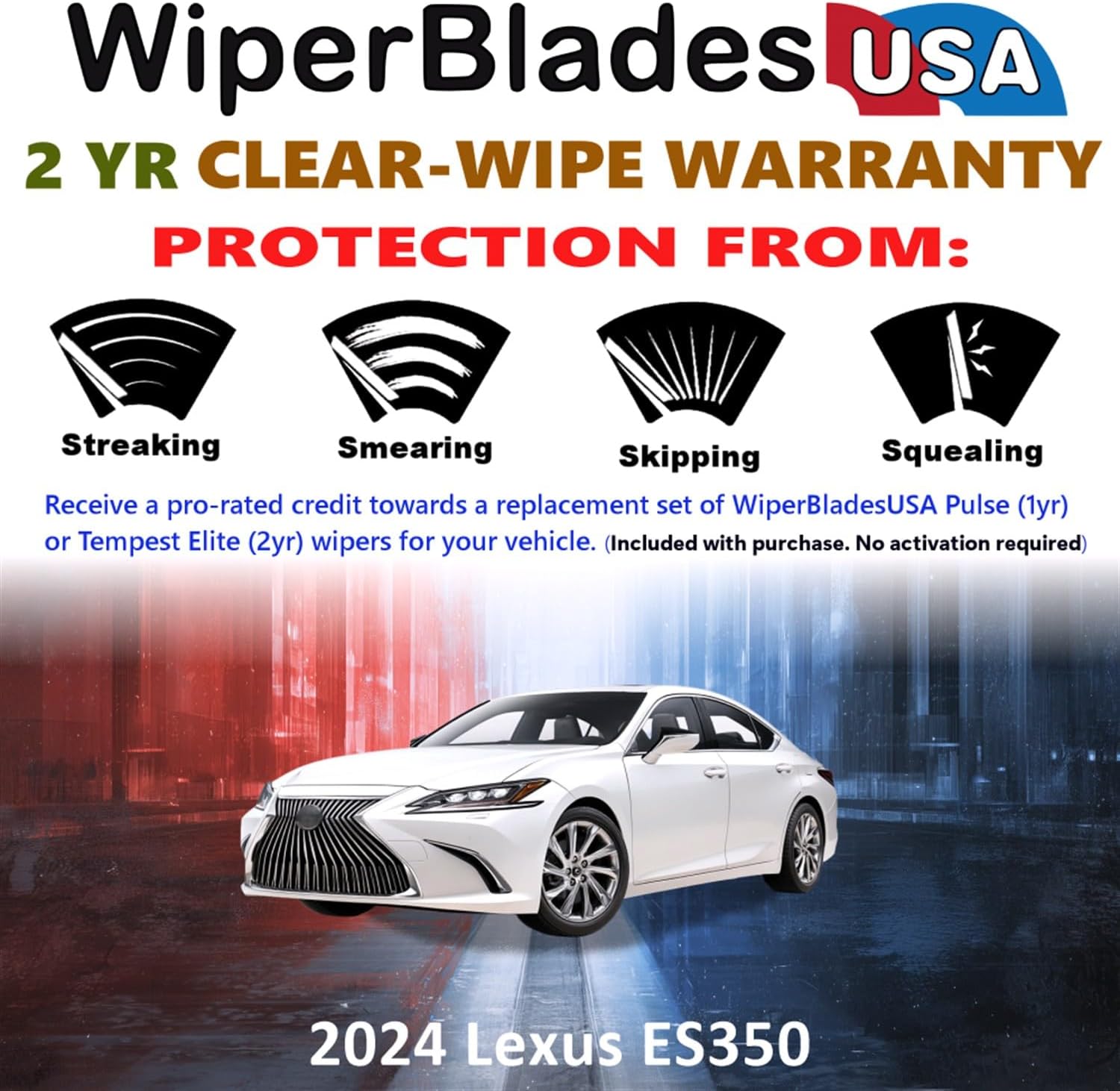 Tempest Elite Beam wiper blades wipers set is compatible with Lexus ES350 2024WiperBladesUSA Beam Wiper Blades - Durable Flexible Beam Blade The WiperBladesUSA® wiper blade contour to the curvature of your windshield to provide even wiping pressure along the full length of the blade. These wiper blades have a 2 years Wiper Wear Warranty included. Meaning if they stop keeping you safe you get a credit towards a fresh pair. (See Details) Don't get caught in heavy rain without this durable beam wiper blades are designed to be compatible with your Lexus ES350 2024 Virtually streak-free visibility Great wipers to have in rain, sleet and snow2 years "Clear-Wipe Warranty"Smooth, chatter-free wipe is a result of the specially blended teflon rubber bladeEnhanced flexibility and grip from the durable, rubber-encased substructureSignificant noise reduction and wind lift through a built-in aerodynamic spoiler to keep the wiper on the windshield at freeway speedsAll weather tough wiper blades with a synthetic rubber squeegee that will withstand even the most extreme weather conditionsPrevents ice and snow build-up through the elimination of exposed metal components. Easy Installation: Included in the bundle are directions (w/video) to simple and easy to use step-by-step installation on to your vehicle