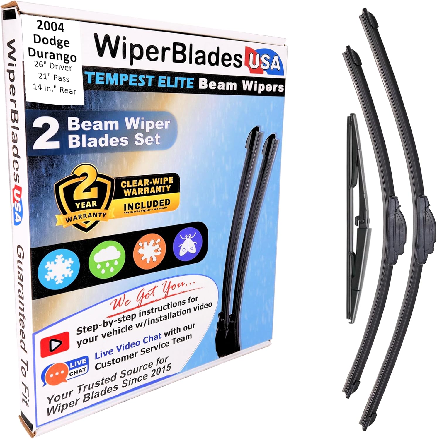Tempest Elite Beam wiper blades wipers set is compatible with Dodge Dakota 2004WiperBladesUSA Beam Wiper Blades - Durable Flexible Beam Blade The WiperBladesUSA® wiper blade contour to the curvature of your windshield to provide even wiping pressure along the full length of the blade. These wiper blades have a 2 years Wiper Wear Warranty included. Meaning if they stop keeping you safe you get a credit towards a fresh pair. (See Details) Don't get caught in heavy rain without this durable beam wiper blades are designed to be compatible with your Dodge Dakota 2004 Virtually streak-free visibility Great wipers to have in rain, sleet and snow2 years "Clear-Wipe Warranty"Smooth, chatter-free wipe is a result of the specially blended teflon rubber bladeEnhanced flexibility and grip from the durable, rubber-encased substructureSignificant noise reduction and wind lift through a built-in aerodynamic spoiler to keep the wiper on the windshield at freeway speedsAll weather tough wiper blades with a synthetic rubber squeegee that will withstand even the most extreme weather conditionsPrevents ice and snow build-up through the elimination of exposed metal components. Easy Installation: Included in the bundle are directions (w/video) to simple and easy to use step-by-step installation on to your vehicle