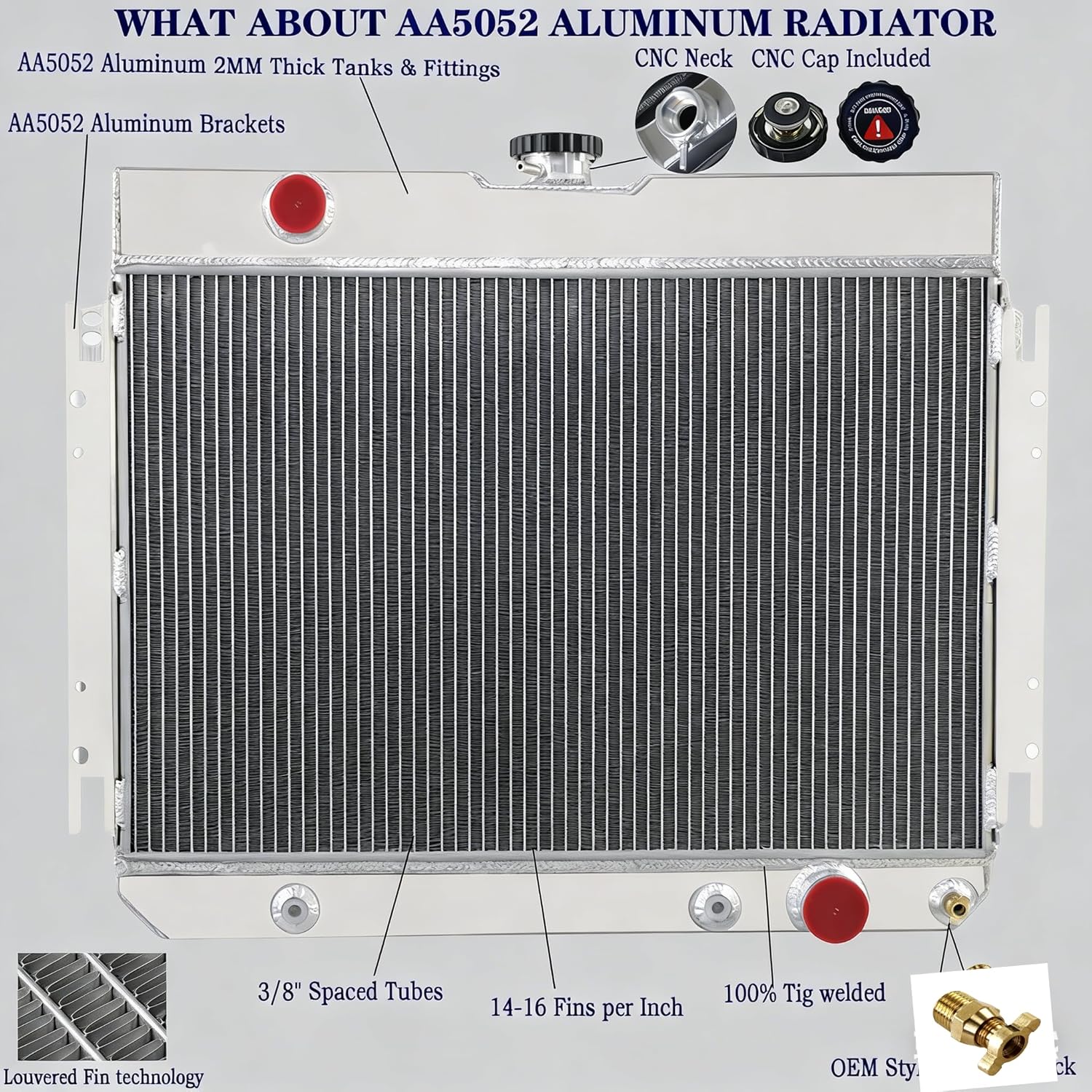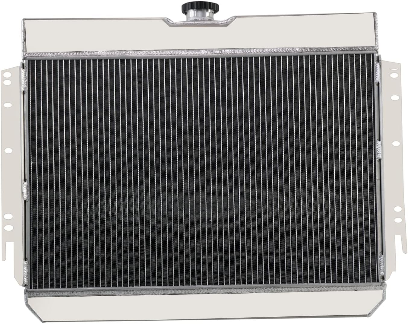 Application:1963-1968 CHEVY BELAIR ALL ENGINES1963-1968 CHEVY IMPALA ALL ENGINES1966-1968 CHEVY CAPRICE ALL ENGINES1964-1967 CHEVY CHEVELLE ALL ENGINES1964-1967 CHEVY EL CAMINO ALL ENGINES1963-1968 CHEVY BISCAYNE ALL ENGINESRadiator Configuration:High Performance Racing Spec.3-Row of tubes Core Racing DesignCore Size: 16" HIGH X 25 1/4" WIDEOVERALL DIMENSIONS:22" HIGH X 27 3/4" WIDEInlet Hose Connection: 1 1/2 Driver SideOutlet Hose Connection: 1 3/4 Passenger SideOil Cooler: 12"Tank Size: 3 X 25 7/16 - BothMOUNTING BRACKET BOLT HOLE SPECS: 26 3/4" WIDE CENTER TO CENTERWILL FIT AUTOMATIC OR MANUAL TRANSMISSIONSUpgrade performance:Made of High Quality Full T-5057 Aircraft Aluminum Construction.Machined-billet filler neck for better pressure control.OEM Style Brass Petcock Drain for superior durability and longevity.